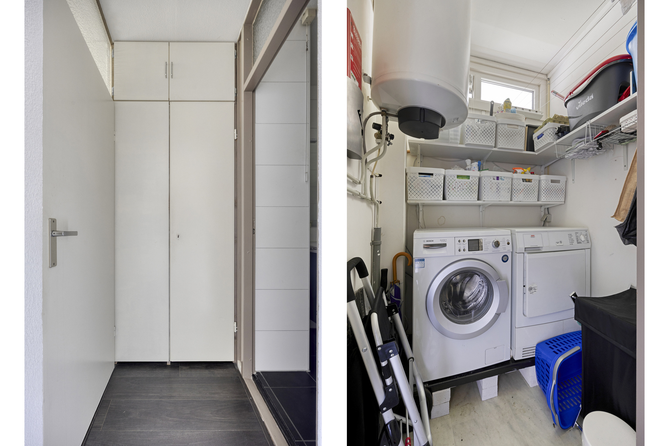 1e etage, entree, hal met aansluitend de was/stookruime en de moderne badkamer voorzien van douche en wastafelmeubel. Aan de voorzijde bevindt zich een ruime slaapkamer met inbouwkast. Vanuit de gang is het toilet te bereiken, en de zeer ruime slaapkamer met toegang tot het balkon. De woonkamer biedt eveneens toegang tot het balkon en de ruime keuken voorzien van diverse inbouwapparatuur en veel werkruimte.