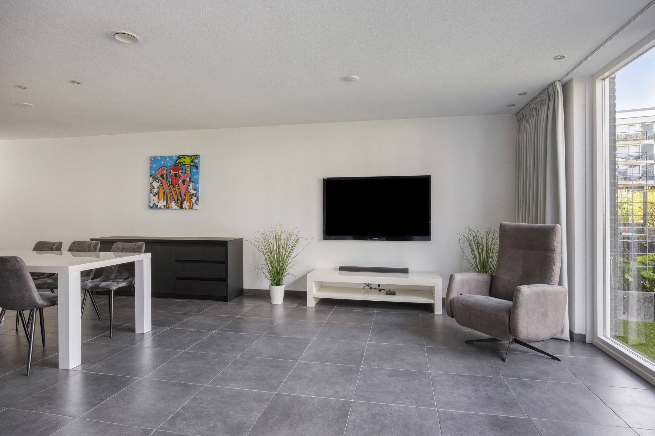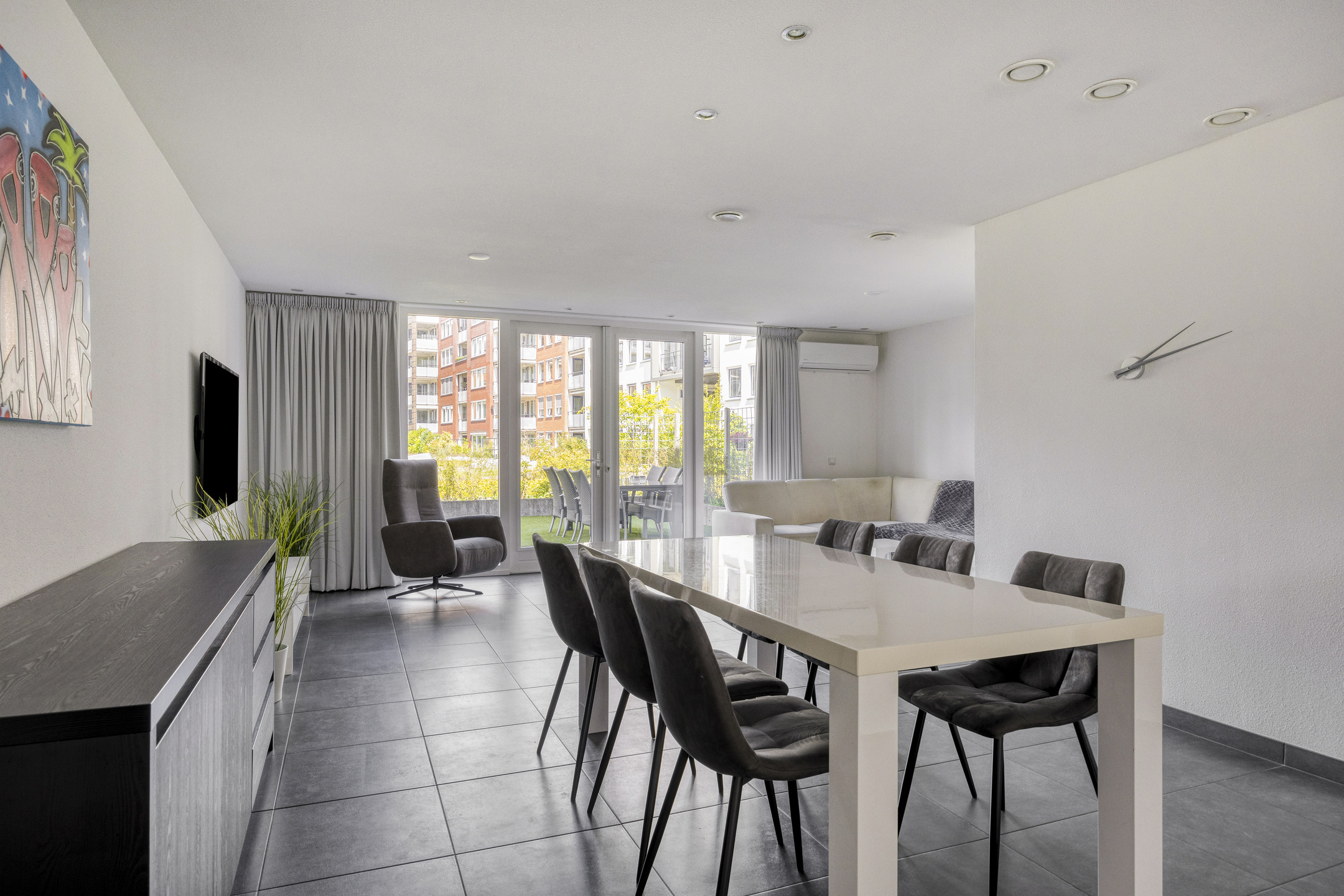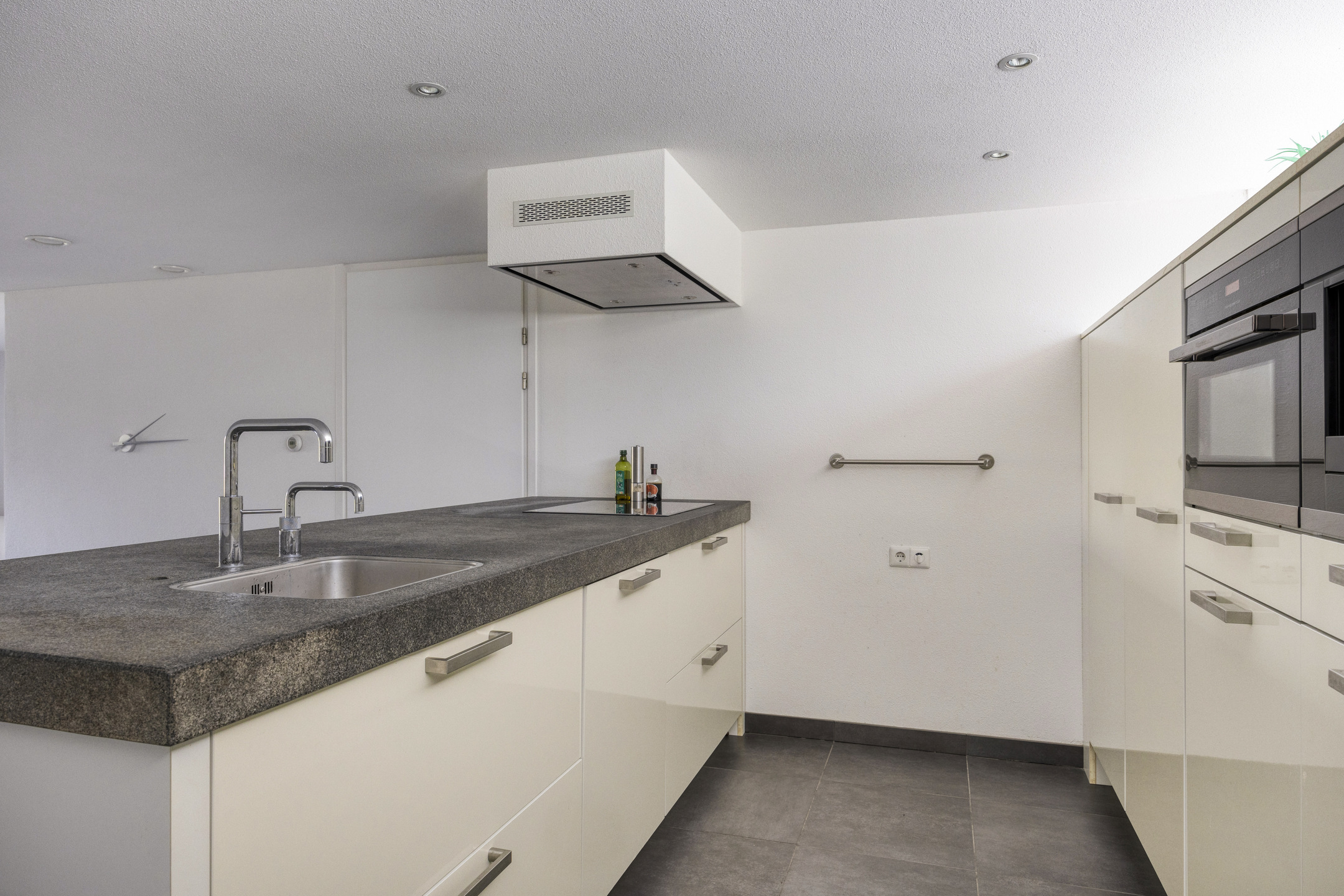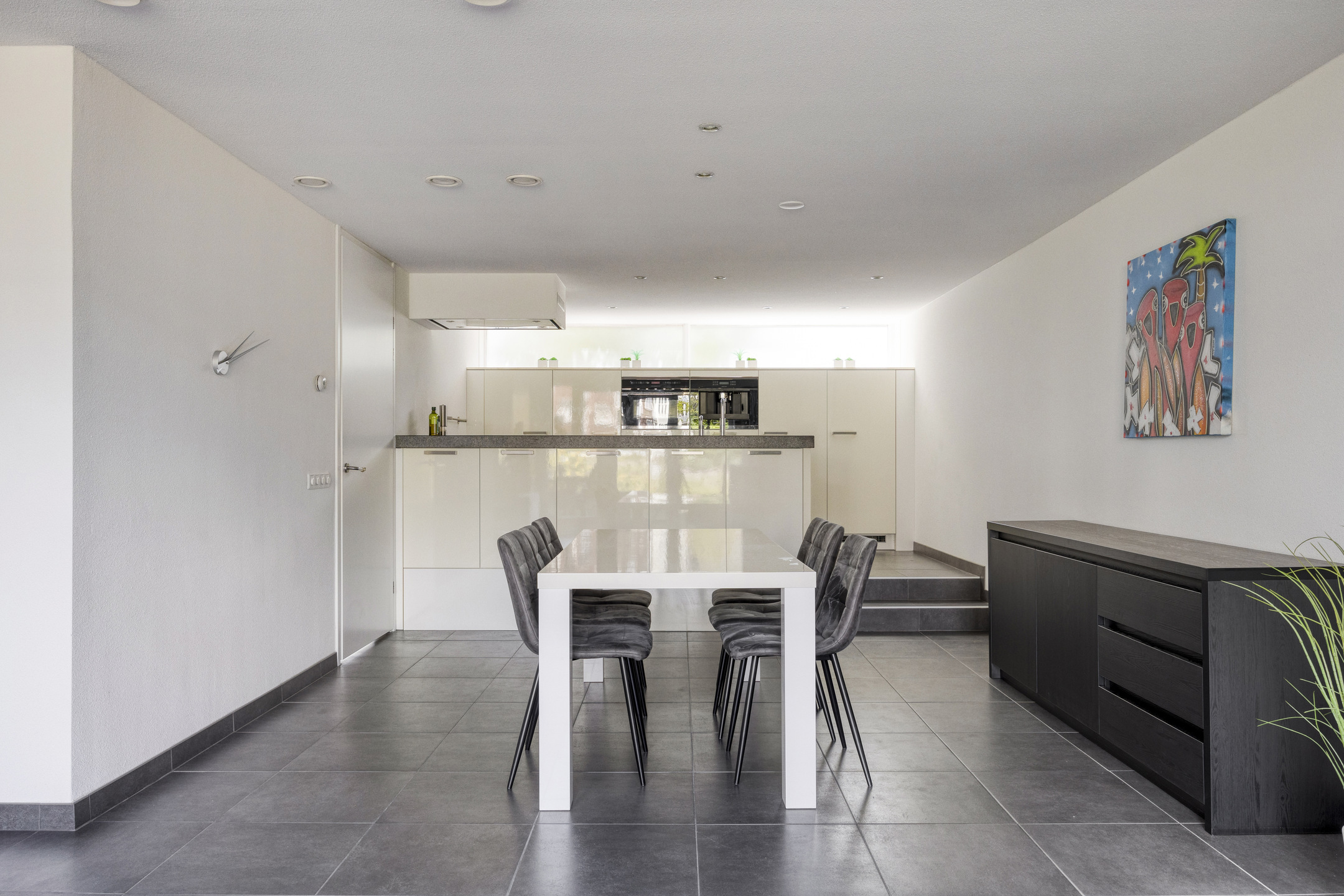 Een halve verdieping hoger bevindt zich de moderne keuken, luxe uitgevoerd met diverse inbouwapparatuur en gelegen op een verhoogd niveau, wat een open maar toch aparte eetkeuken creëert.