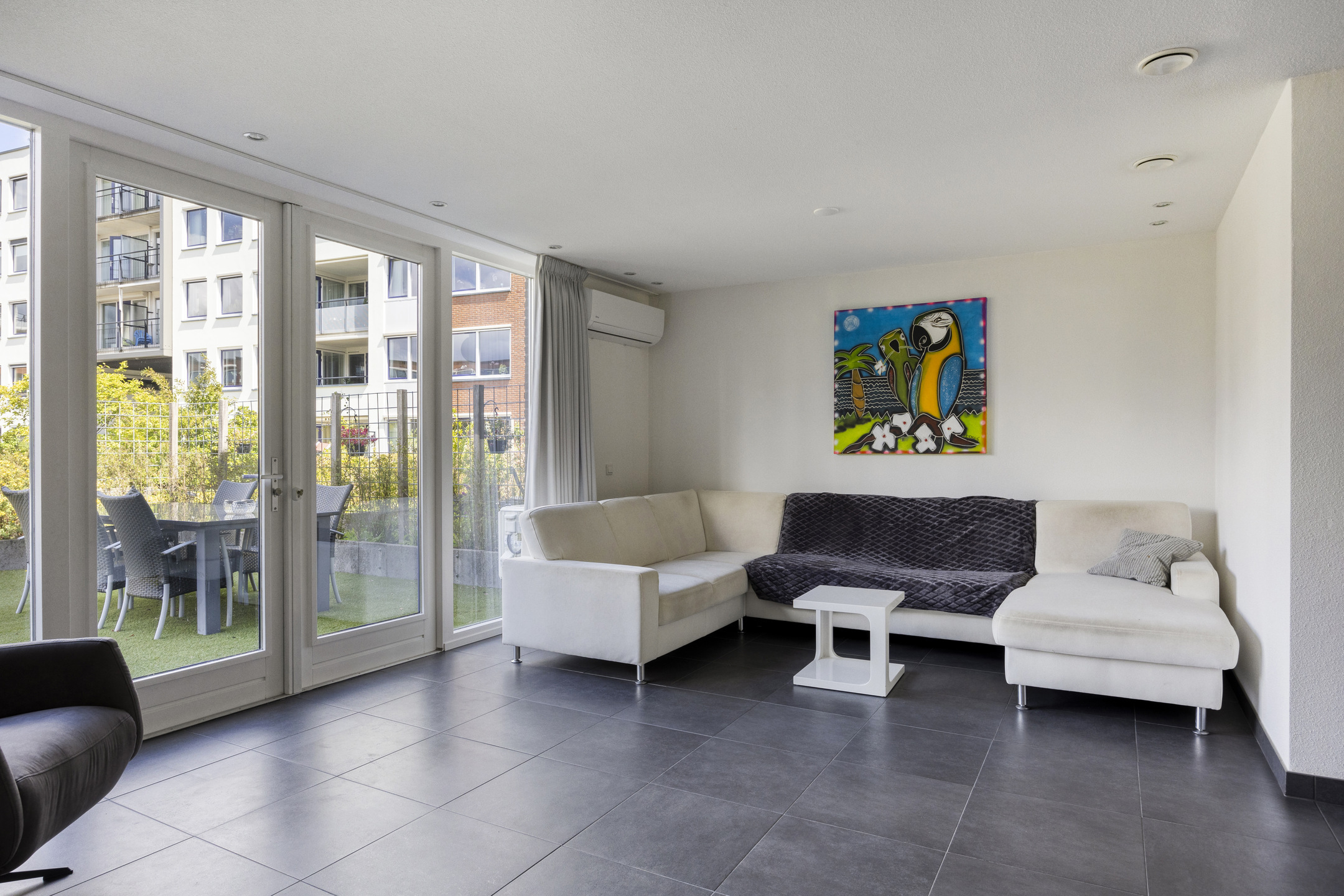 De woning heeft een gedeeltelijk split-level indeling, wat zorgt voor een speels karakter en veel lichtinval. Via de entree kom je in de ruime woonkamer, die direct toegang biedt tot de tuin. Deze tuin grenst aan de fraai aangelegde binnentuin van het appartementencomplex Quatre Mains, wat zorgt voor rust, privacy en een groene omgeving.