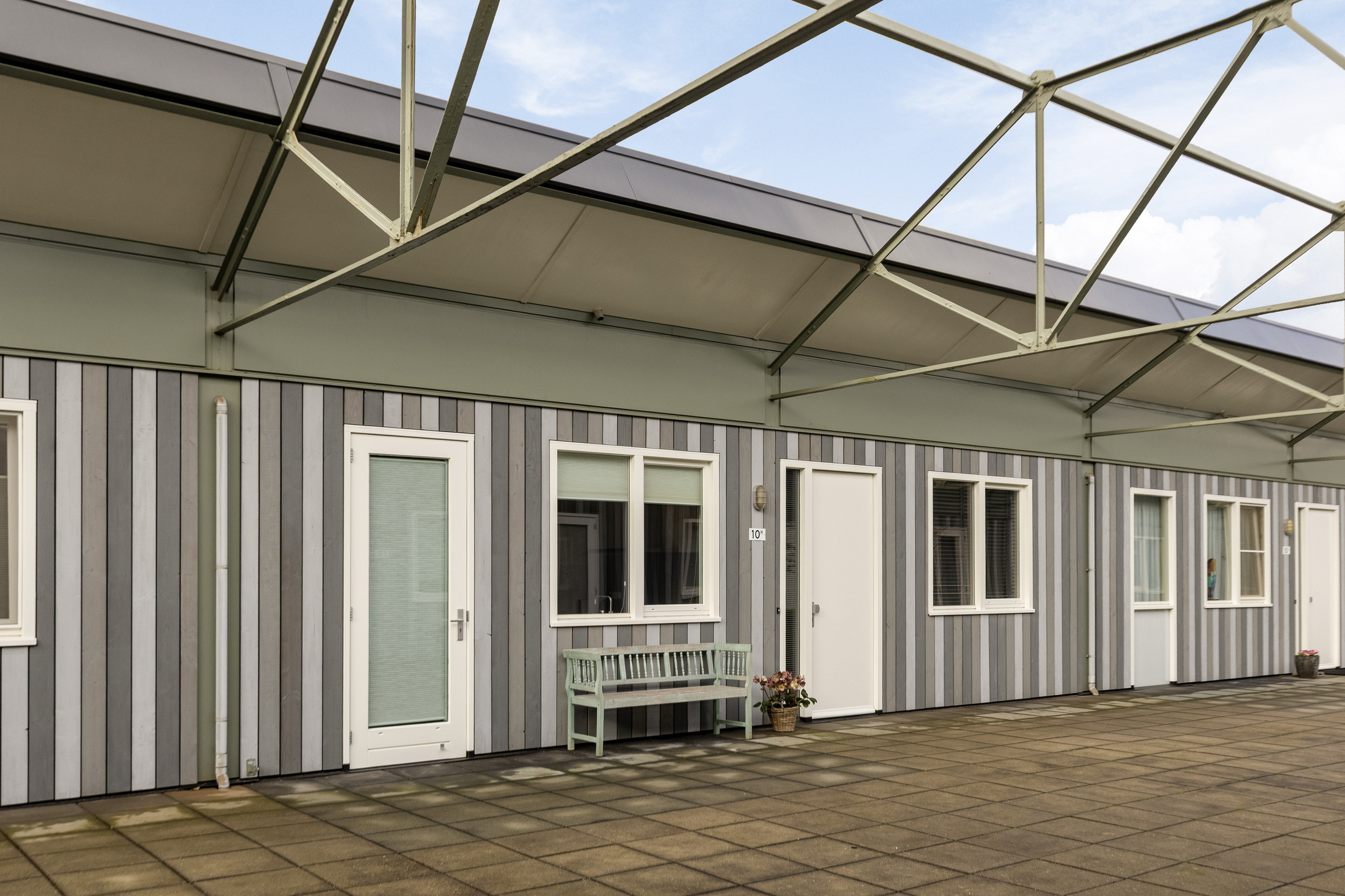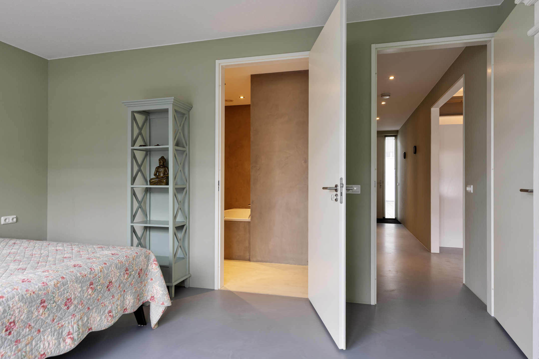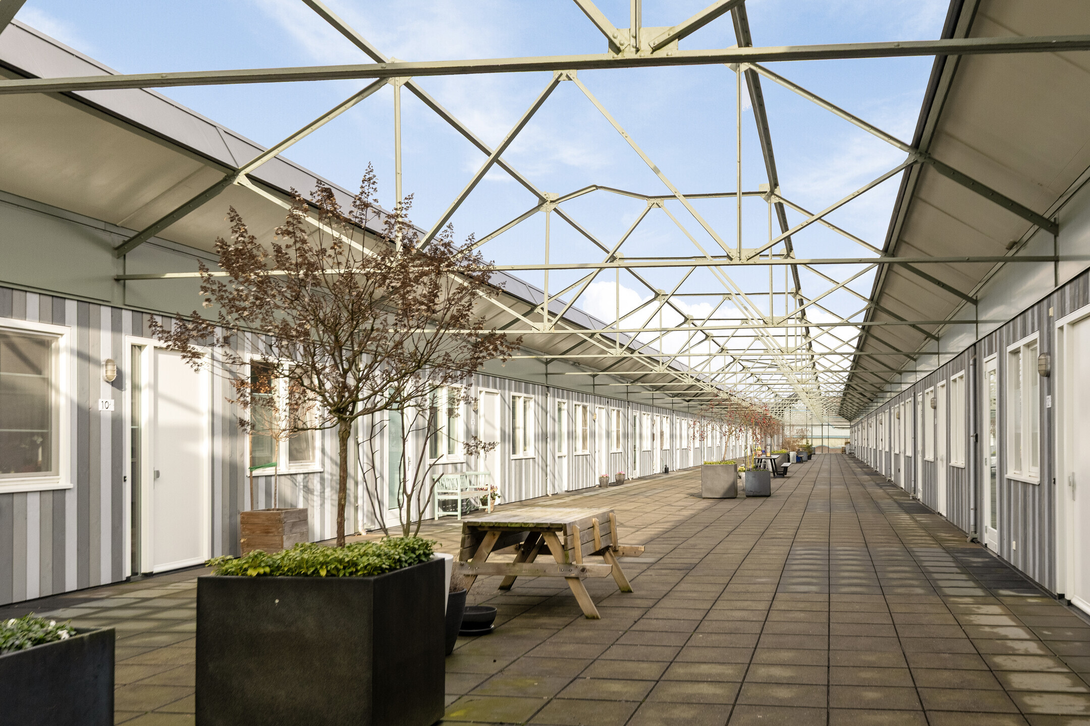 Via de galerijachtige woonstraat bereik je de entree van het appartement. Deze woonstraat vormt een prettige overgang tussen het openbare en privé gedeelte van het complex.