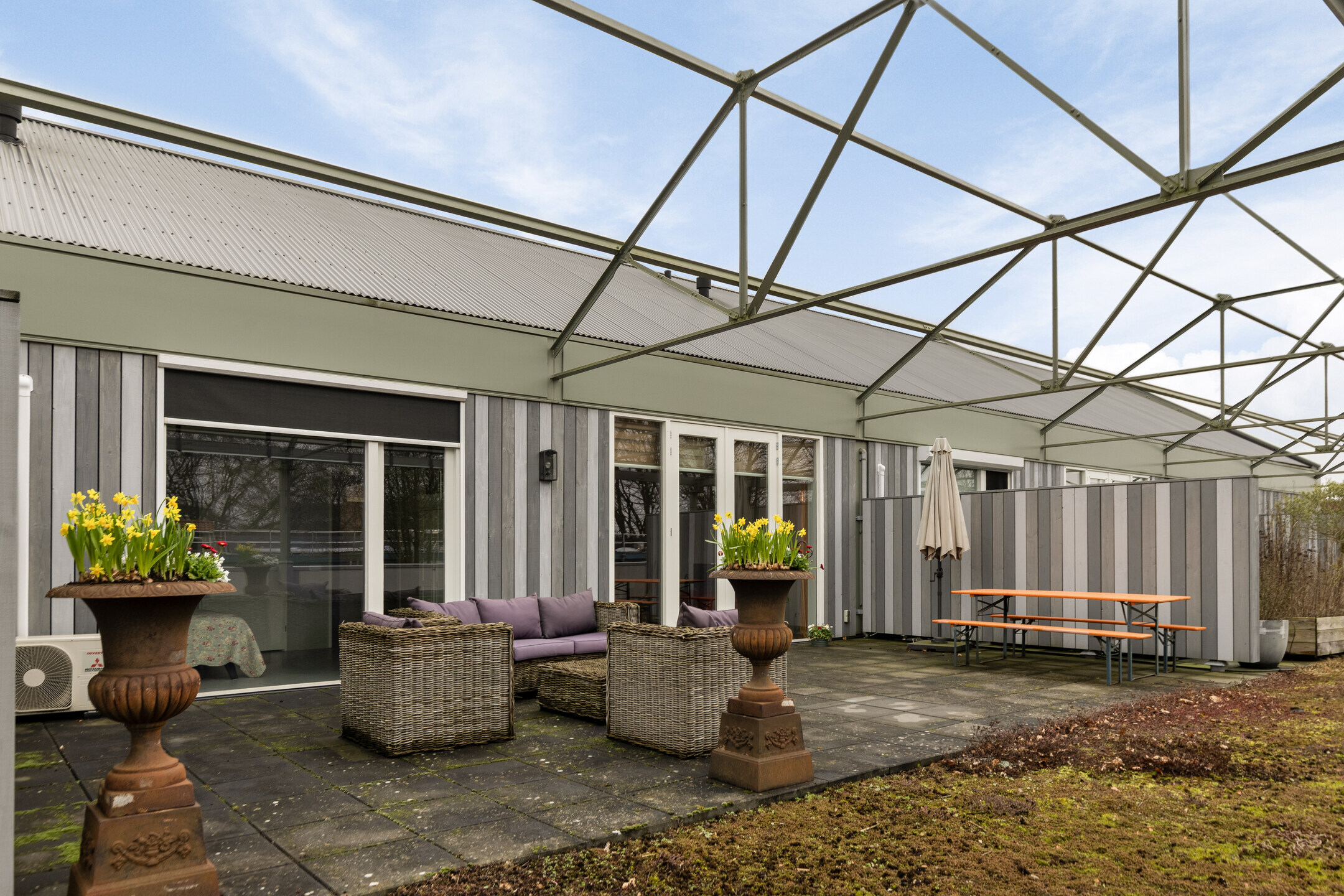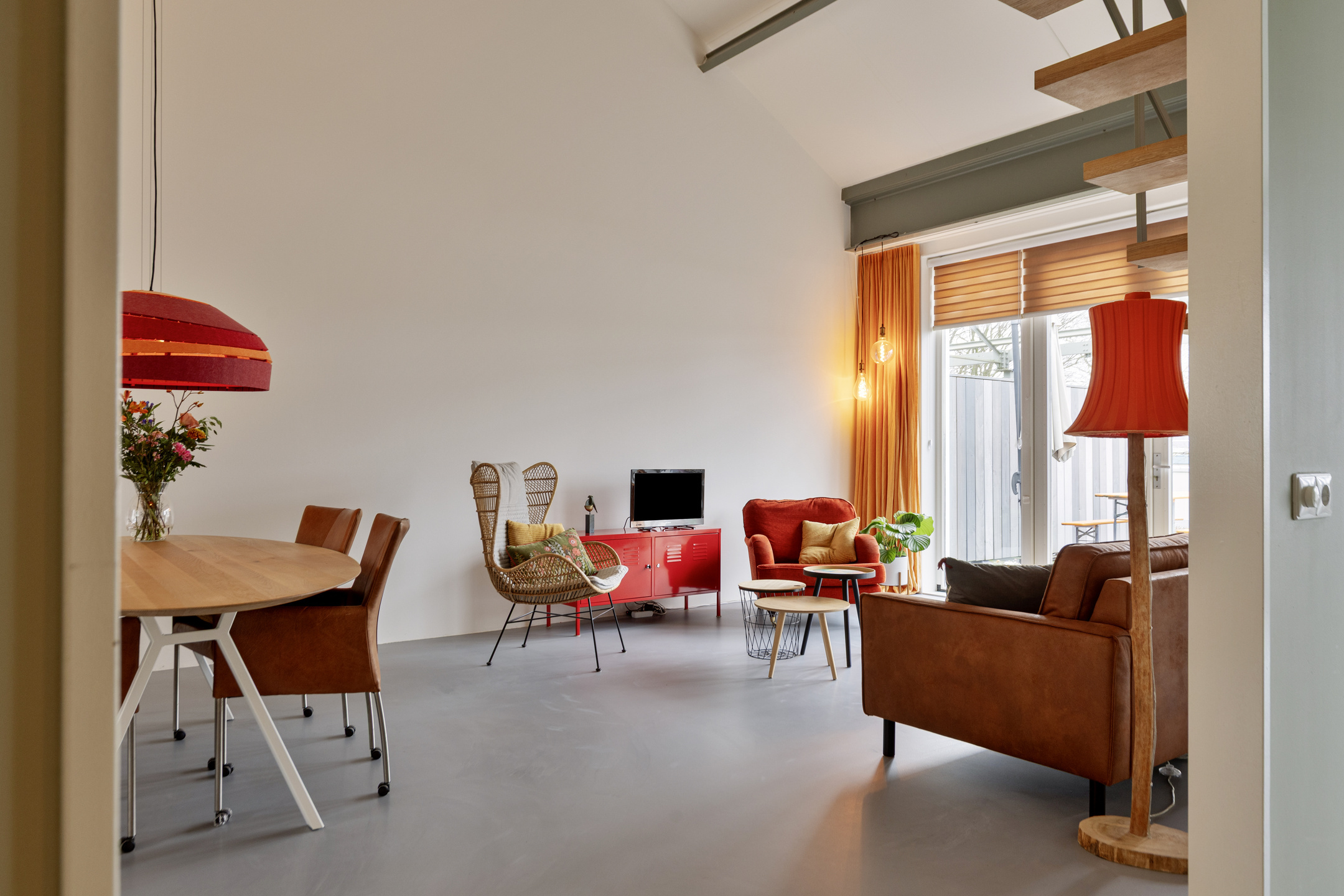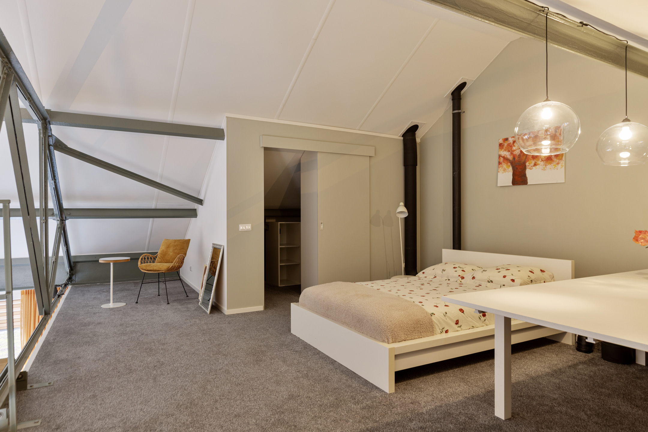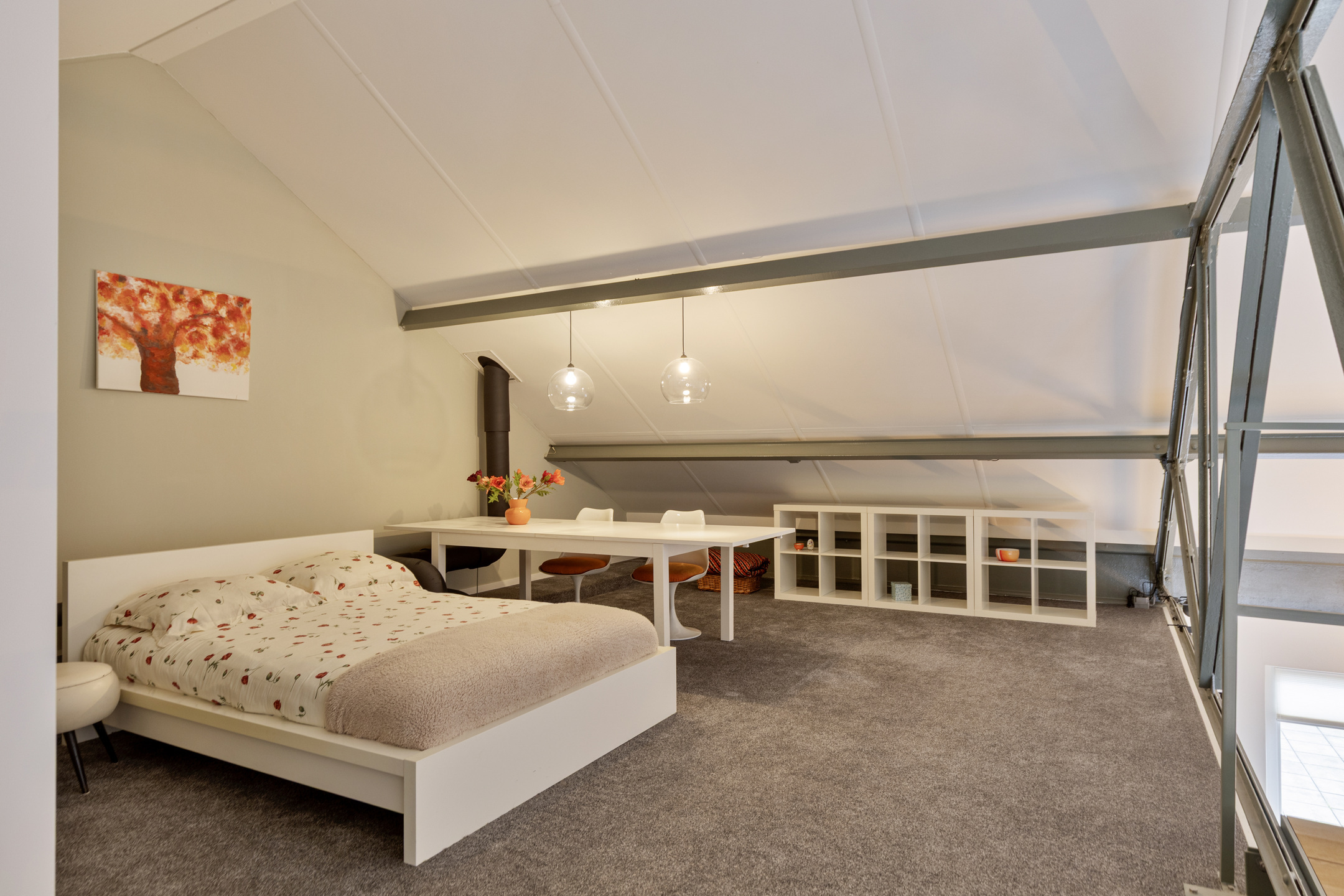 Via een vaste trap bereik je de open verdieping met berging. Deze ruimte kan dienen als werkplek en/of logeerkamer, hobbyruimte of extra lounge.