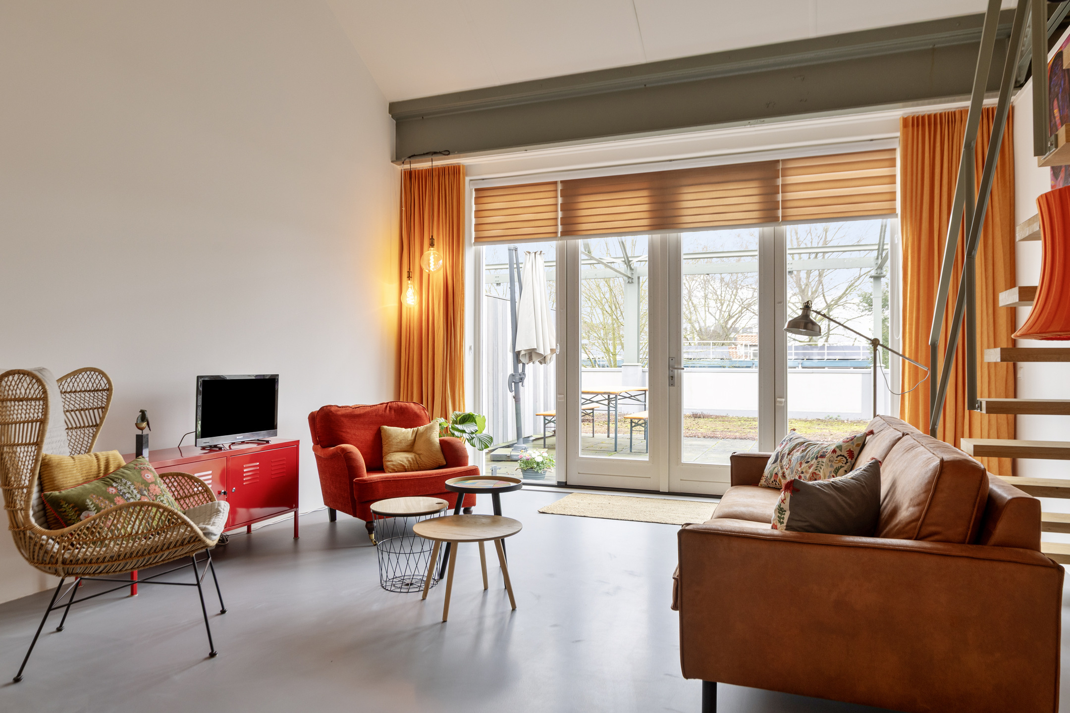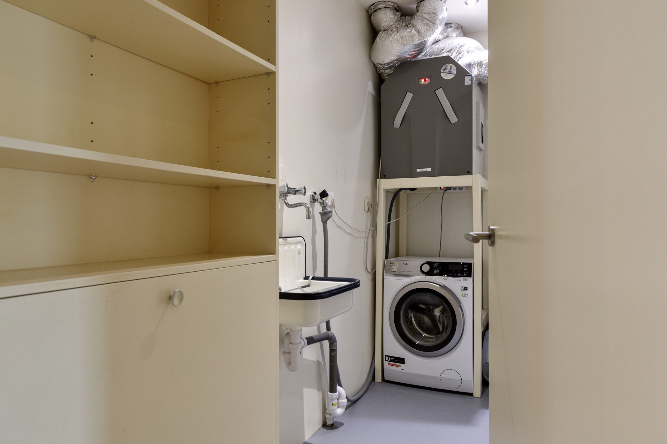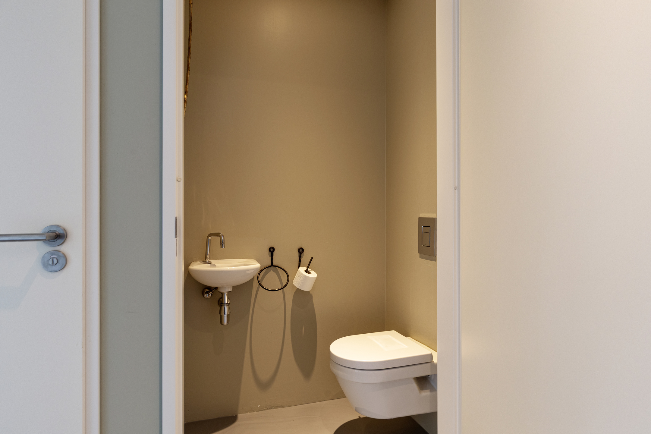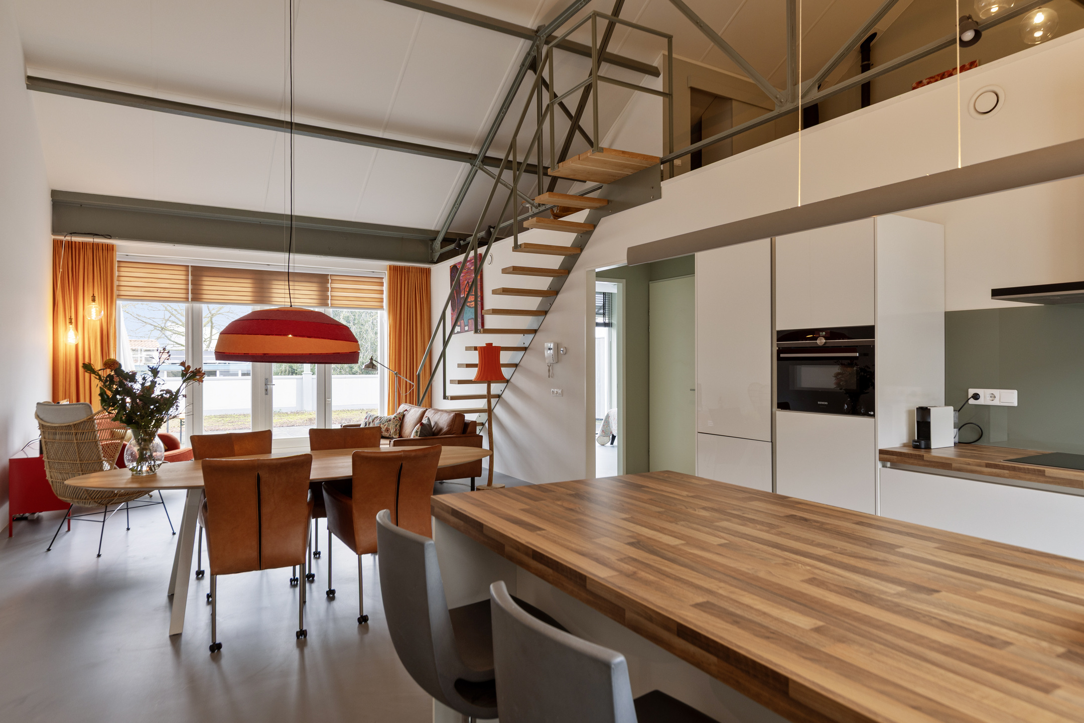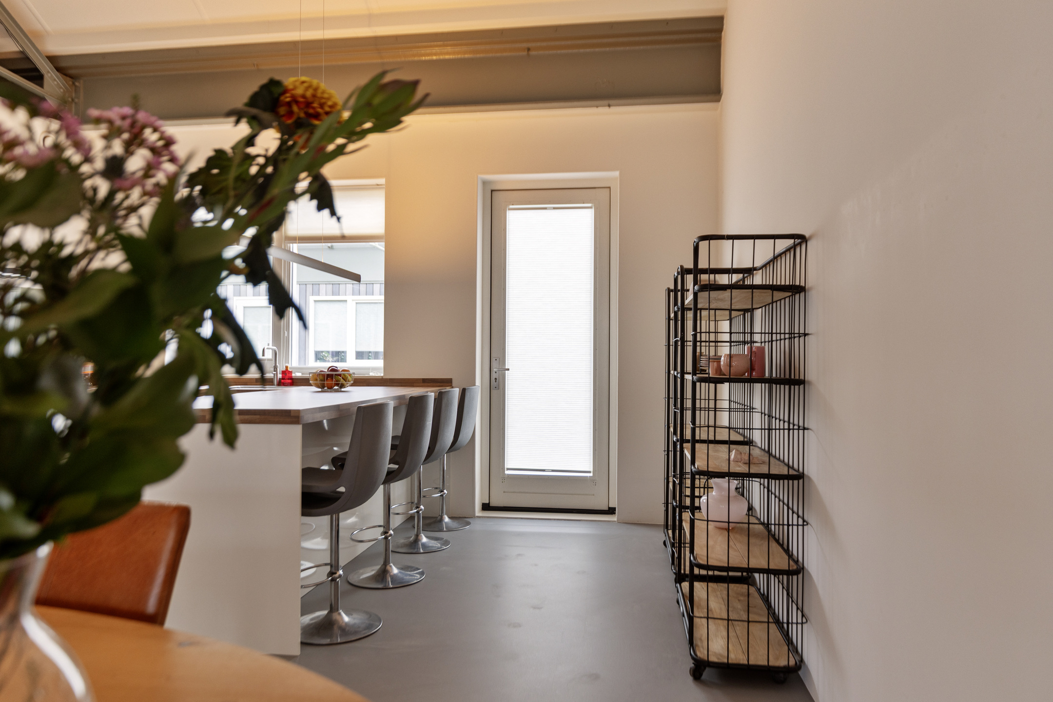 De woning heeft de allure van een penthouse. Grote raampartijen, hoge plafonds en het open karakter zorgen voor een indrukwekkend ruimtelijk gevoel. De royale woonkamer staat in directe verbinding met het dakterras en wordt overspoeld met natuurlijk licht.