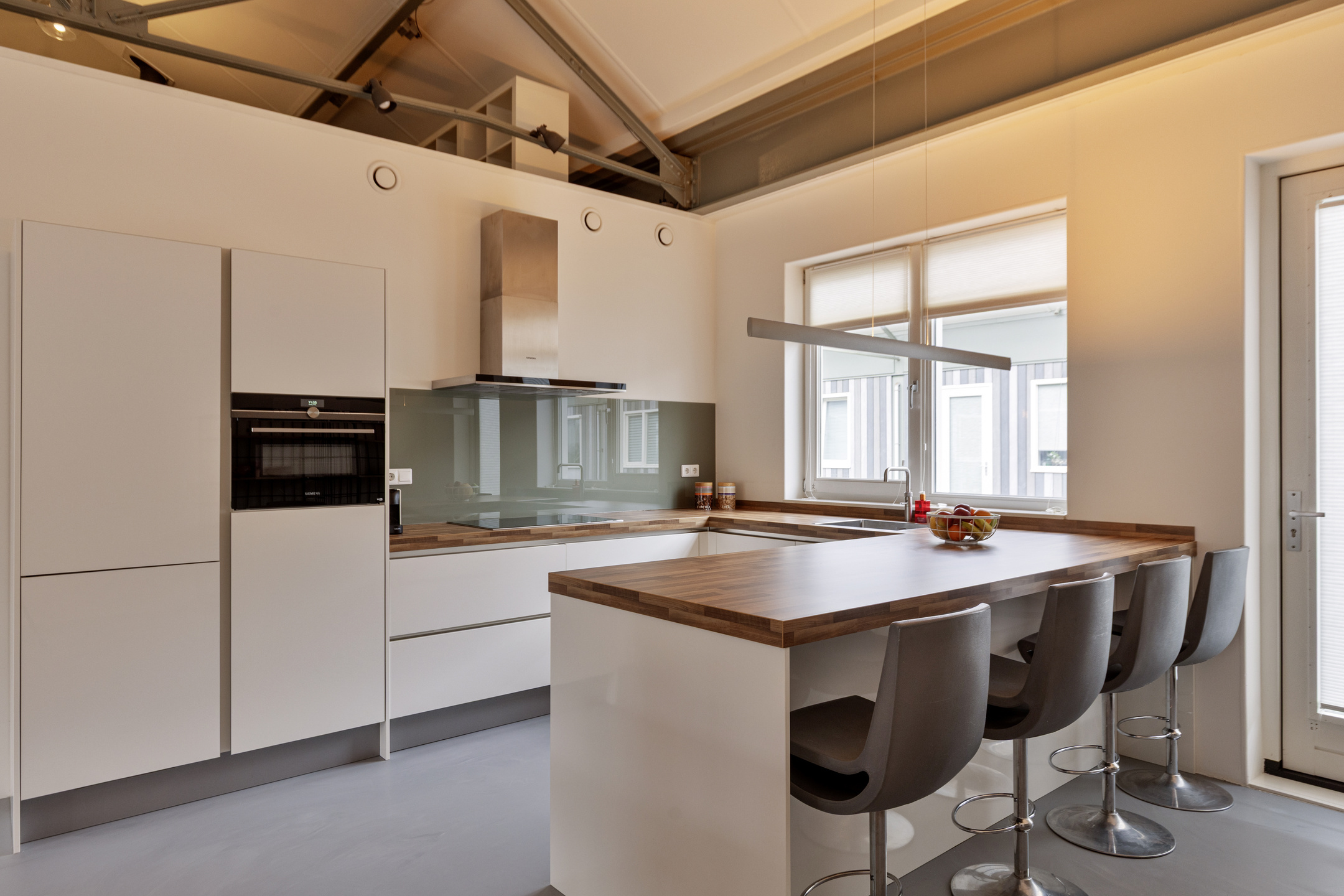 De open woonkeuken vormt het hart van het appartement. Deze moderne keuken met kookeiland is luxe uitgevoerd en voorzien van diverse inbouwapparatuur, waaronder een inductiekookplaat met rvs afzuigschouw, combi-magnetron, vaatwasser, koelkast, quooker en veel bergruimte. Aan het kookeiland kun je gezellig zitten met een drankje terwijl er wordt gekookt – ideaal wanneer je gasten ontvangt.