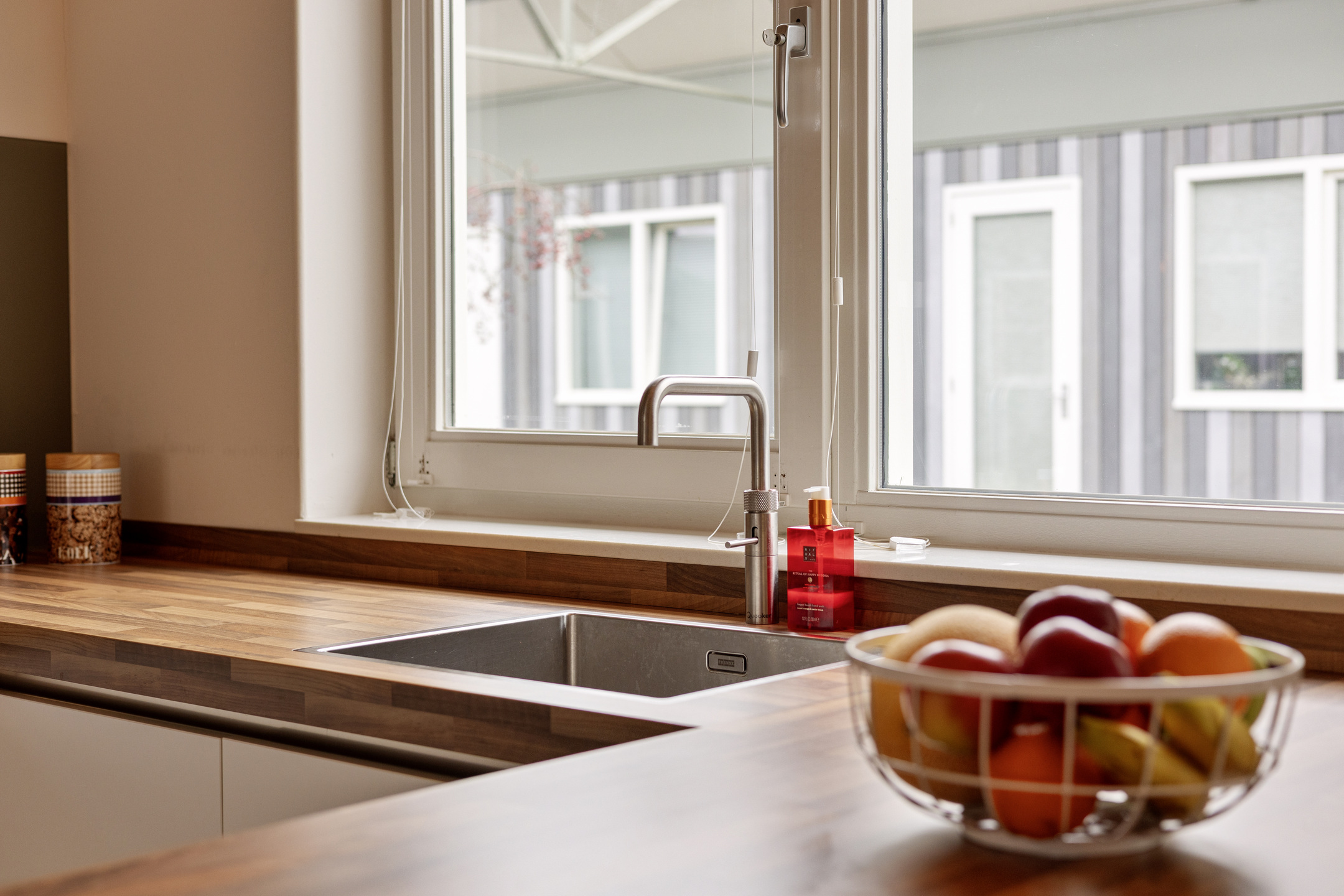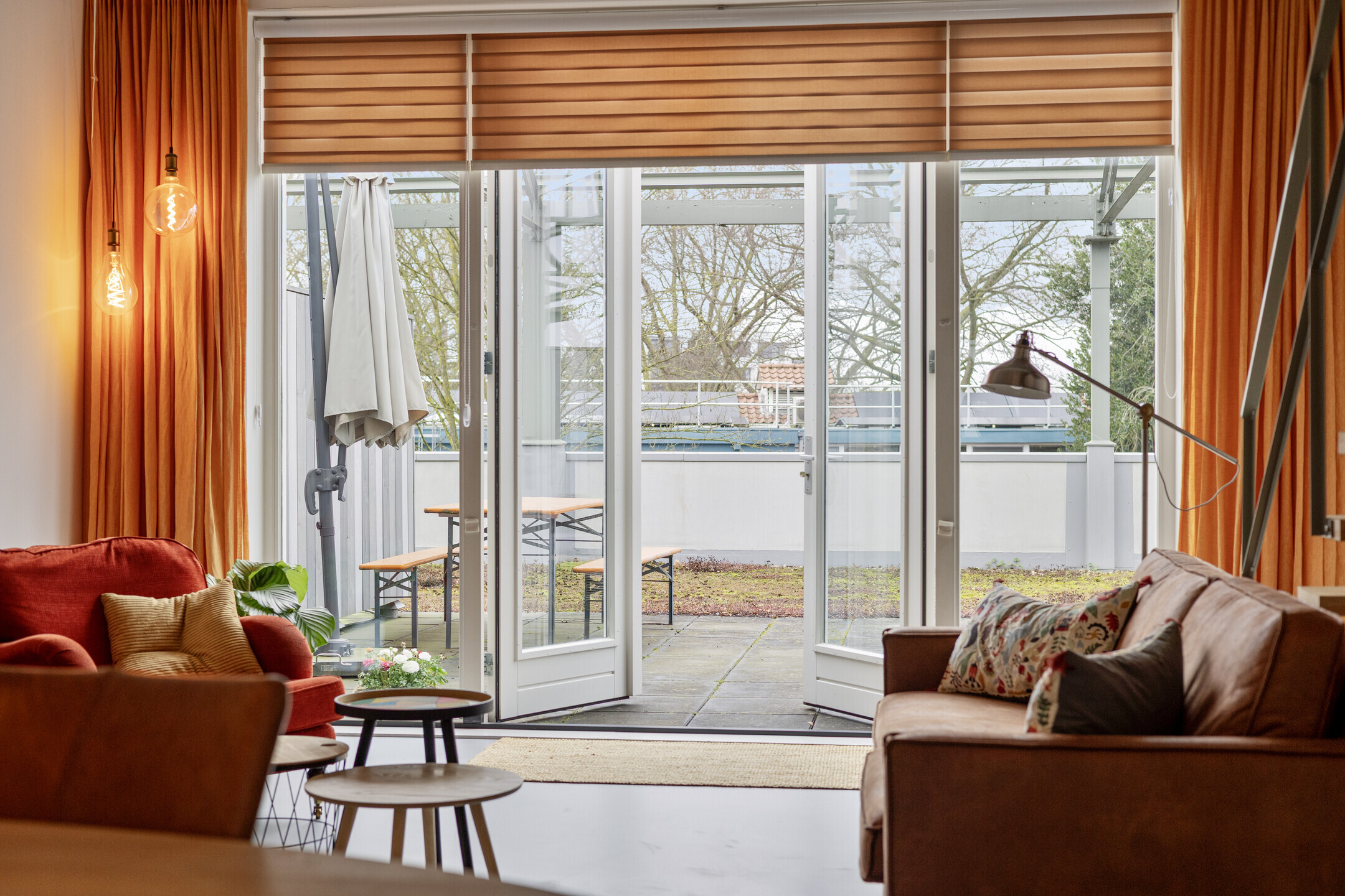 Het terras biedt volop mogelijkheden voor een loungehoek, een grote eettafel of ligstoelen. Een deel van het dak is ingericht met onderhoudsvriendelijke sedumbegroeiing, waardoor je uitkijkt op een groene, rustige buitenruimte die bijna aanvoelt als een eigen stadstuin. Hier geniet je al vroeg in het voorjaar van het buitenleven.