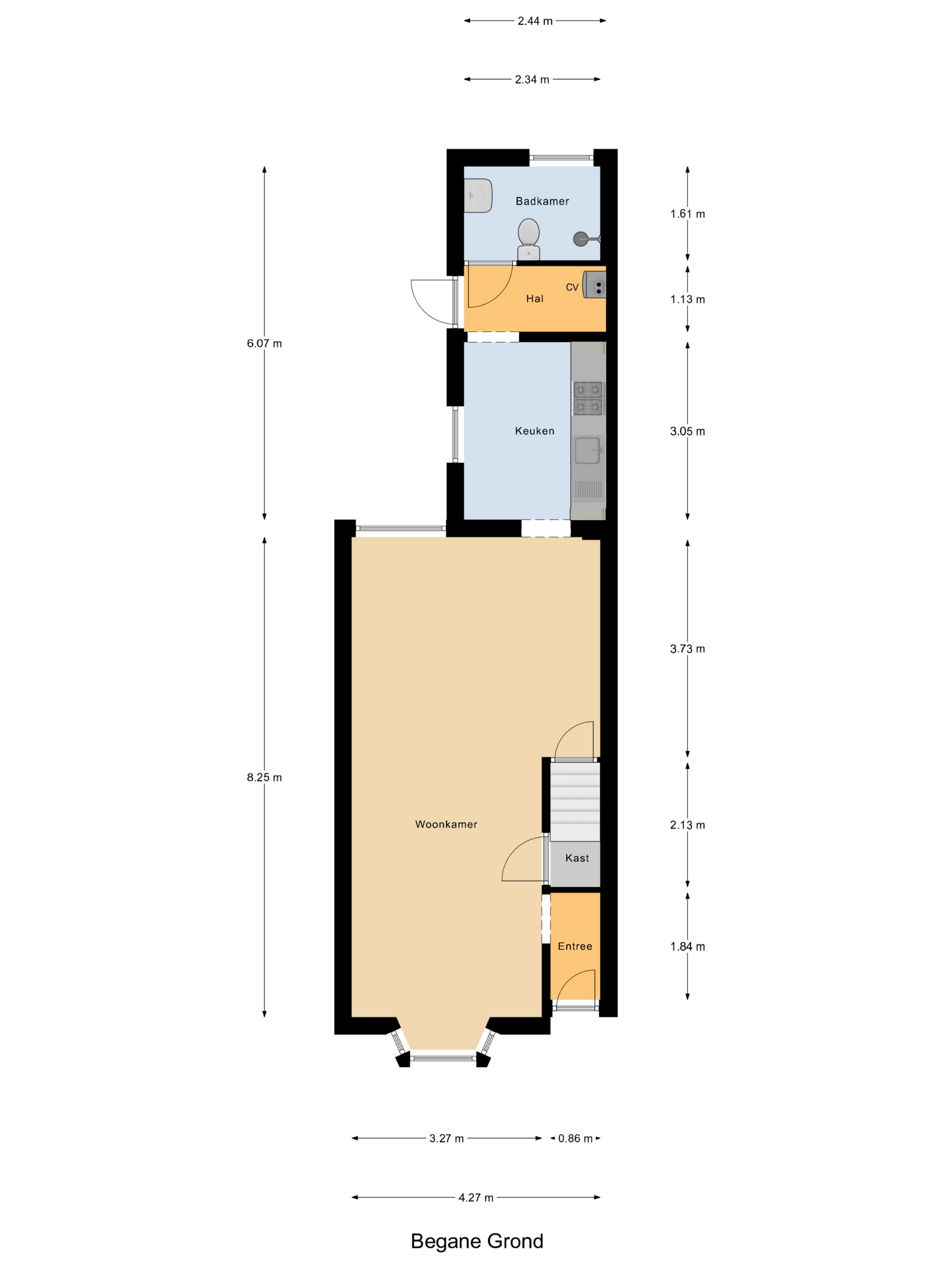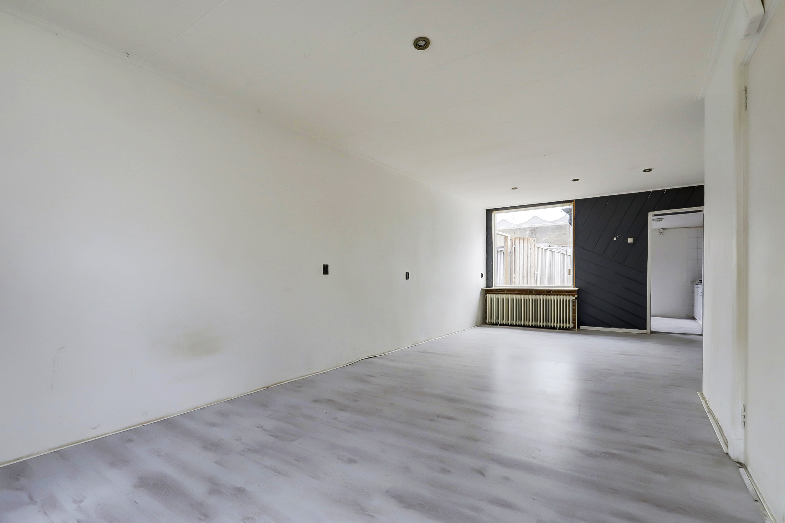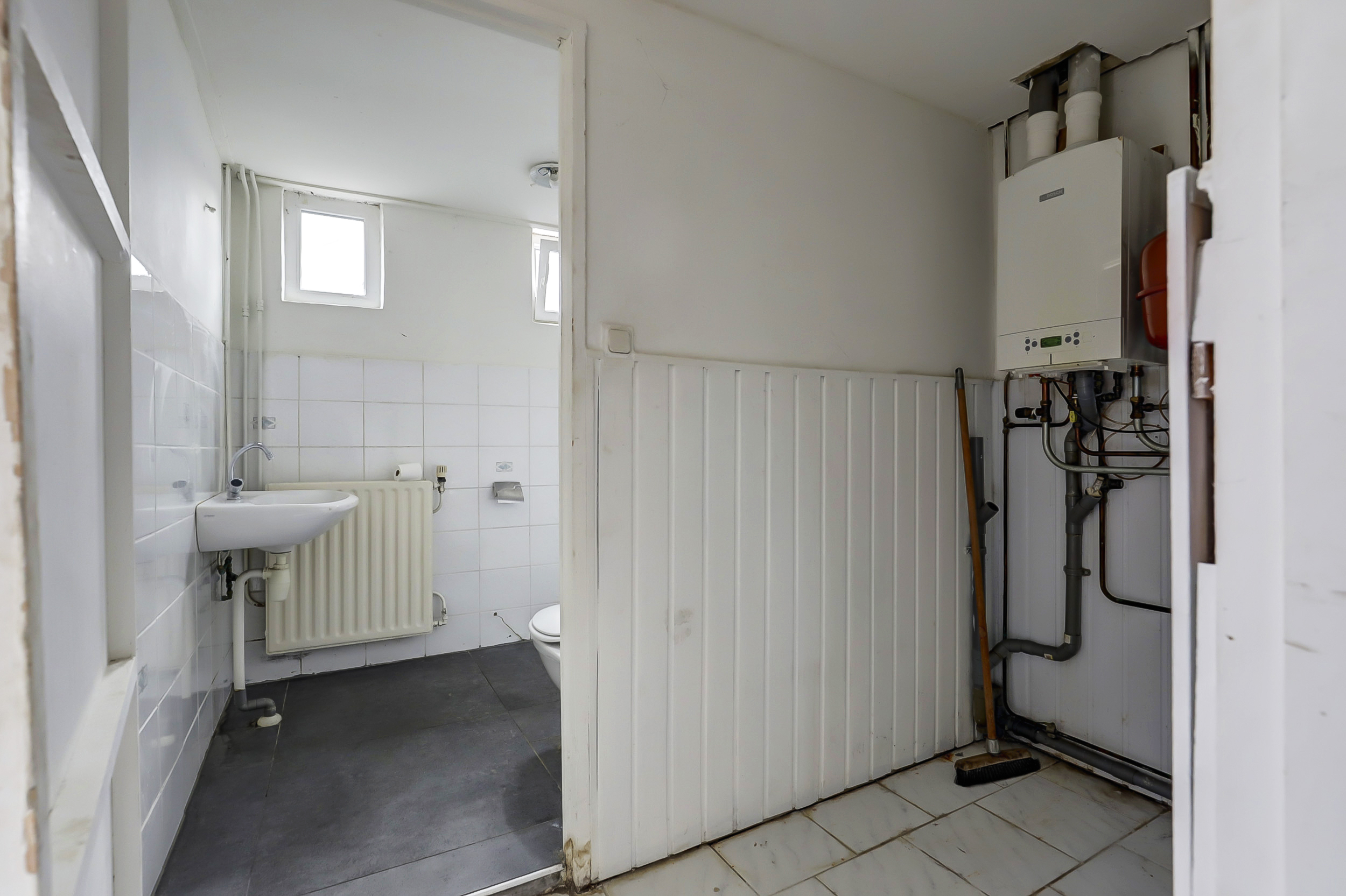 Je komt binnen in de hal, met toegang tot de woonkamer. De woonkamer is lekker licht, ruim (ca. 32 m²) en heeft die kenmerkende erker die meteen sfeer geeft. Aansluitend vind je de keuken (die echt toe is aan vernieuwing) en een bijkeuken met plek voor de CV en wasmachine. De badkamer is eenvoudig en voorzien van een douche, wastafel en toilet.