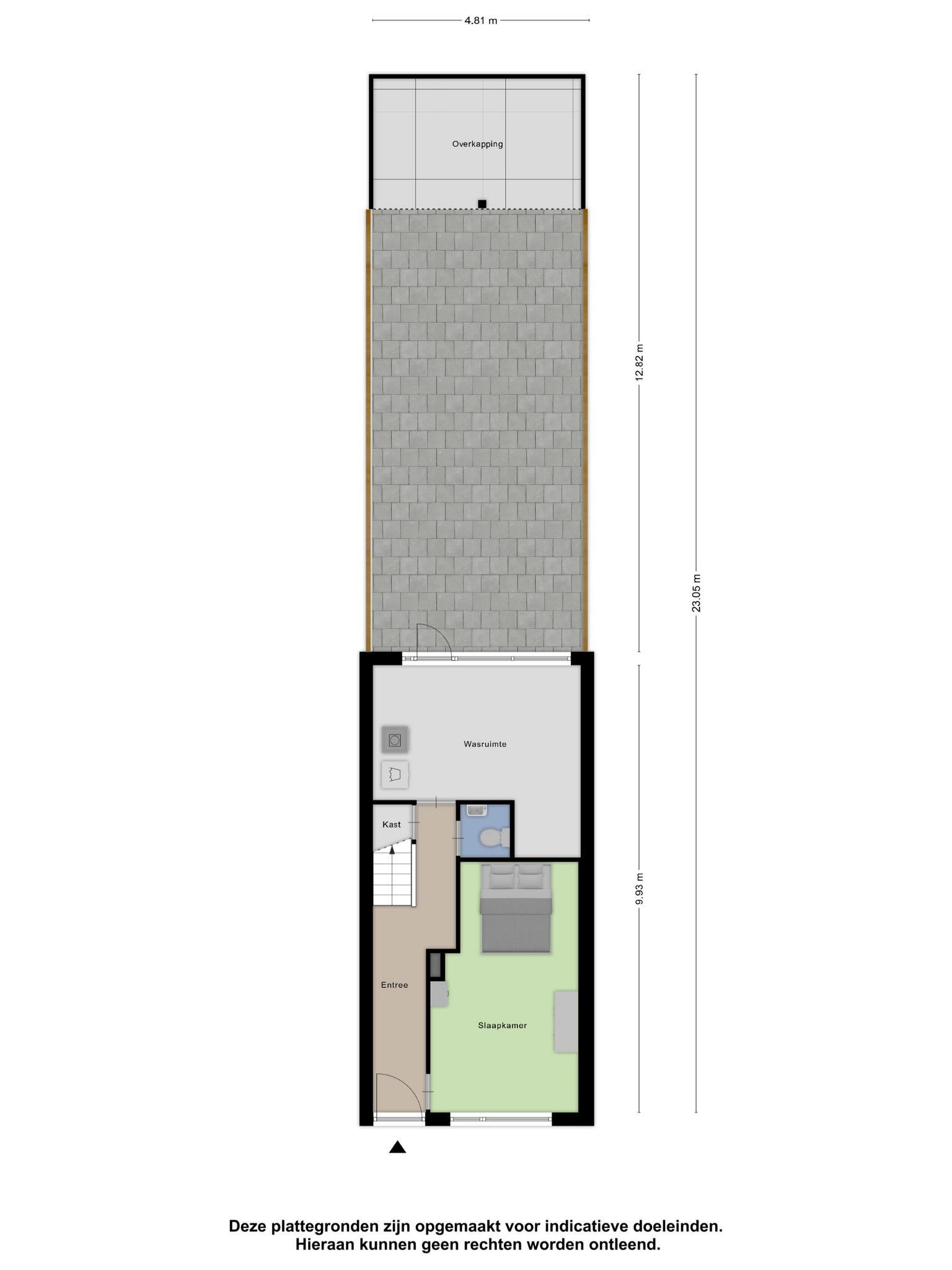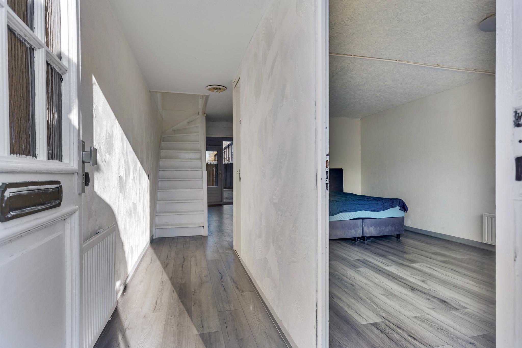 Je komt binnen in de hal, waar je meteen de trap naar boven vindt, een handige berging en een gloednieuwe meterkast. Op deze verdieping zijn twee ruime (slaap)kamers. De voorste kamer was ooit een garage, maar is nu omgebouwd tot een volwaardige ruimte. De achterste kamer wordt momenteel gebruikt als was- en strijkkamer en heeft een deur naar de tuin – ideaal voor een snelle frisse neus of een wasje in de zon laten drogen!