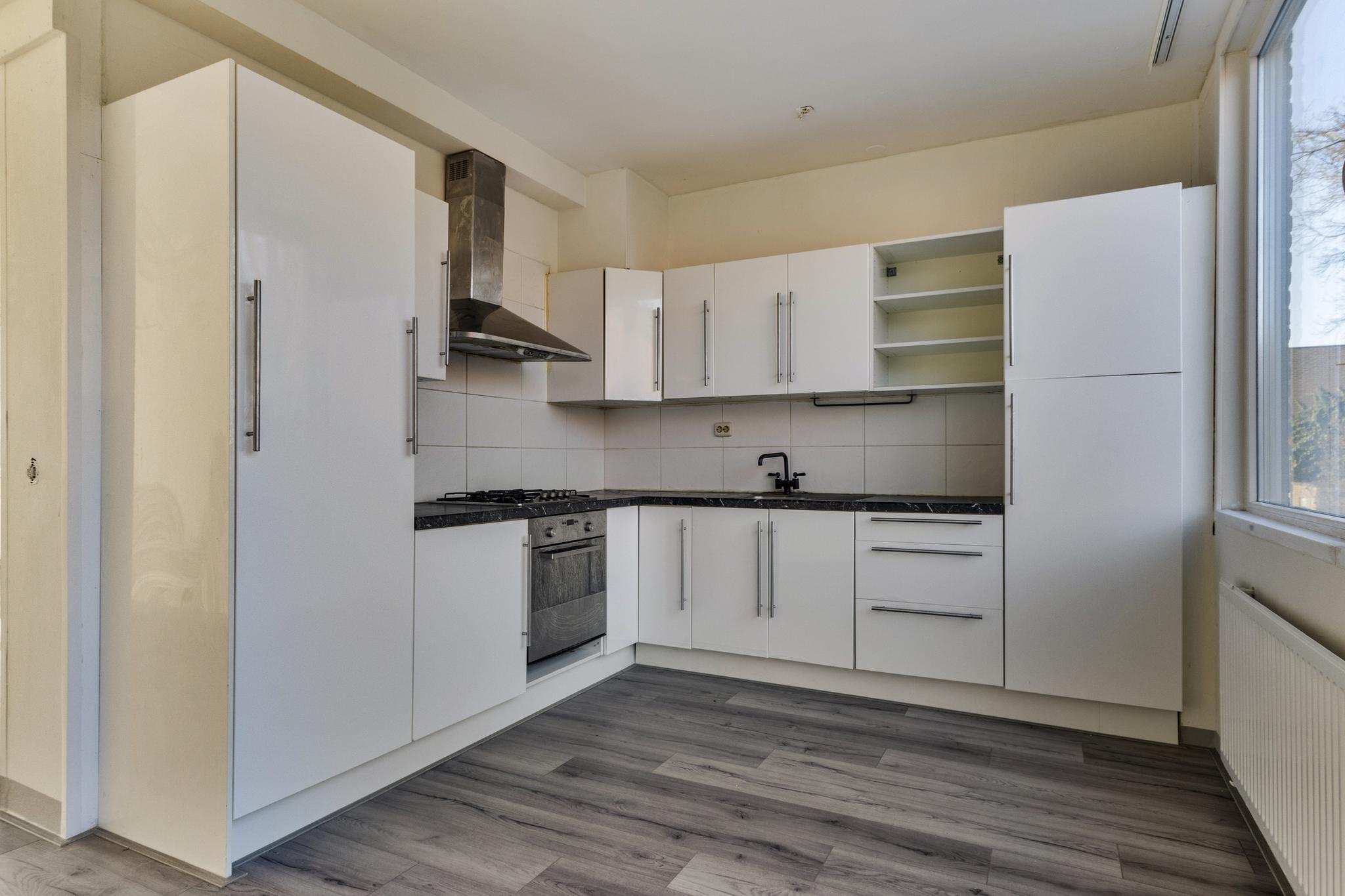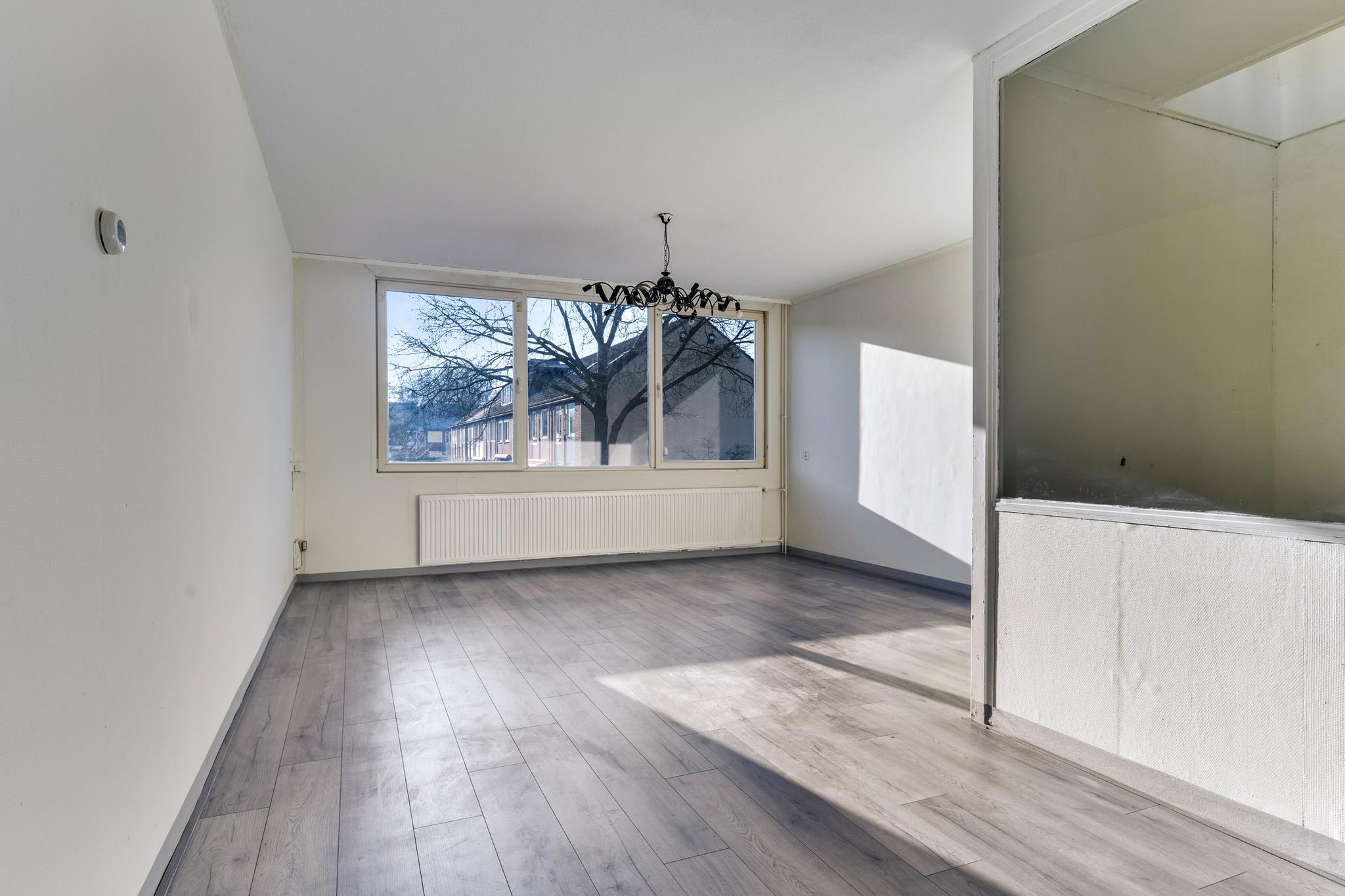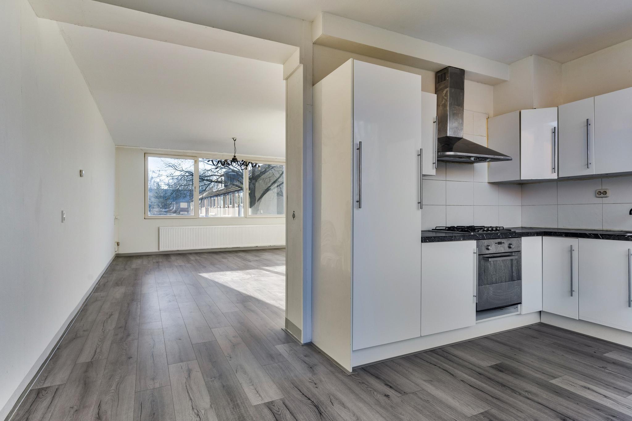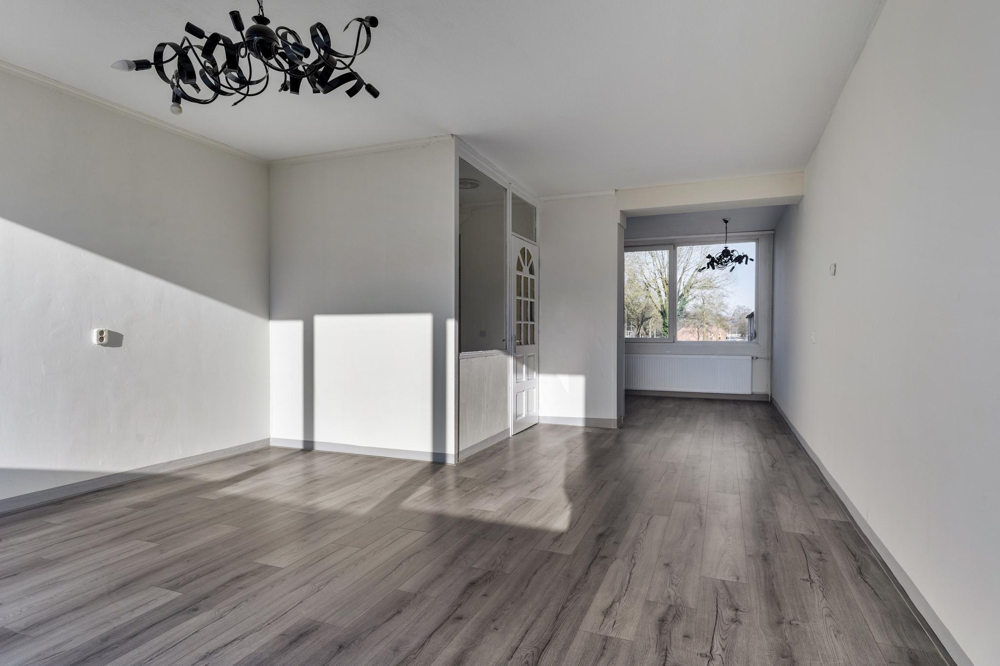 Hier vind je een heerlijk ruime woonkamer waar je alle kanten mee op kunt. Of je nu een grote zithoek wilt of ruimte zoekt voor een lange eettafel, hier kan het allemaal! Aansluitend ligt de keuken, die echt aan vervanging toe is – een mooie kans om er iets totaal naar eigen smaak van te maken.