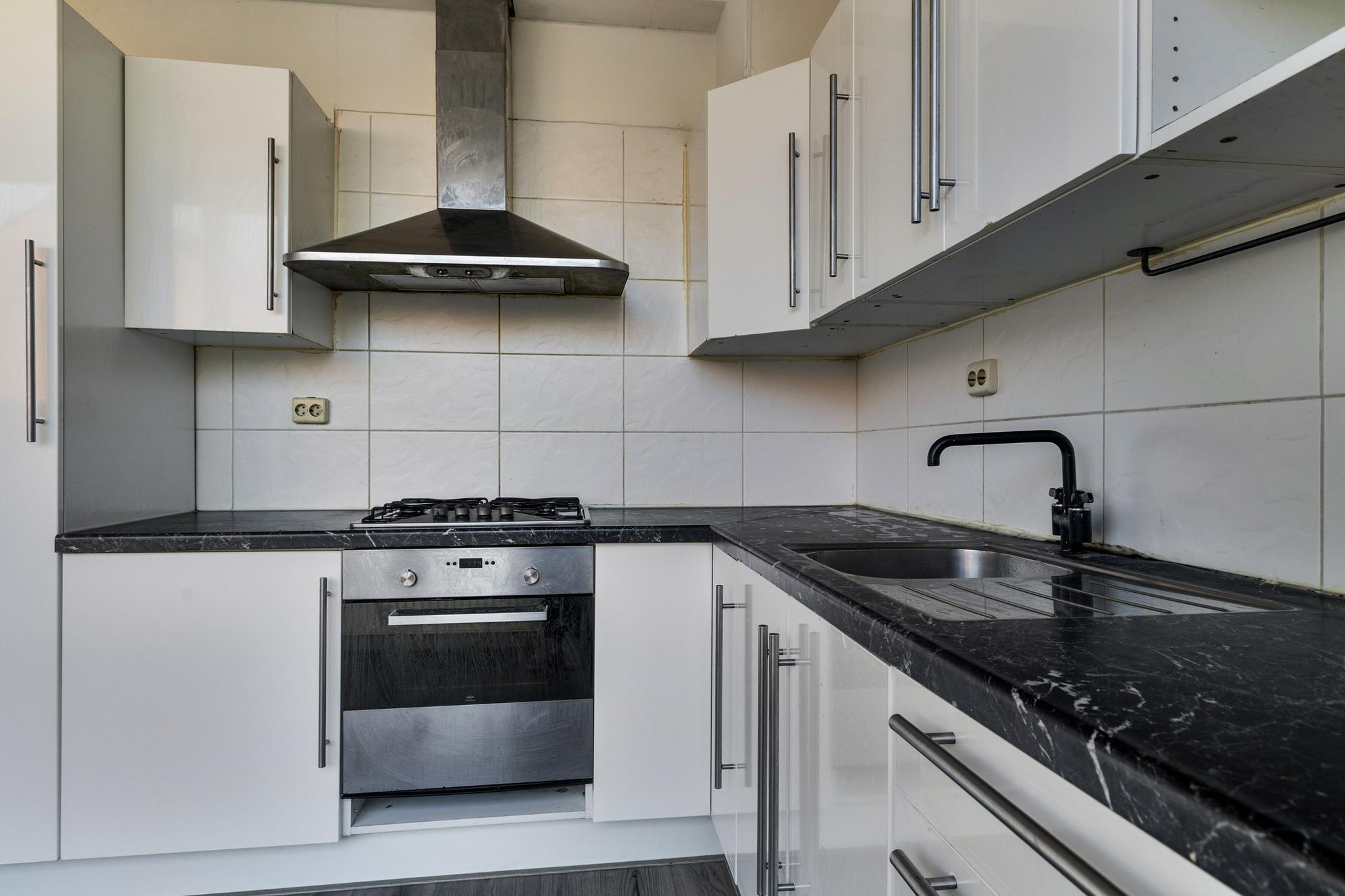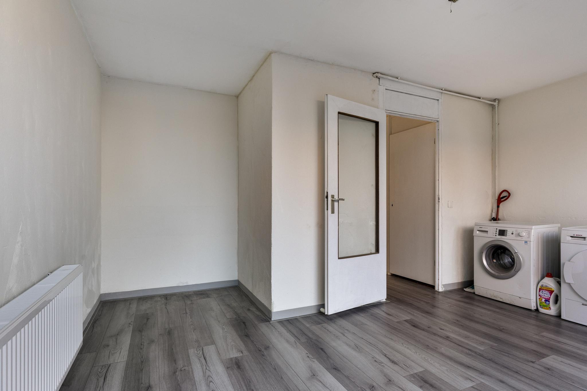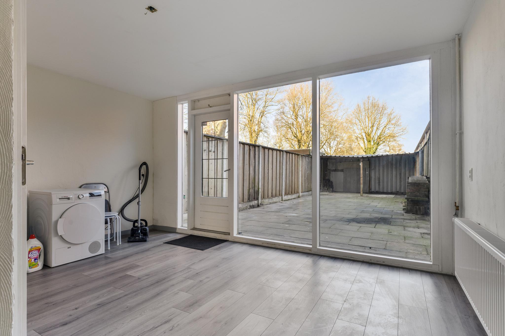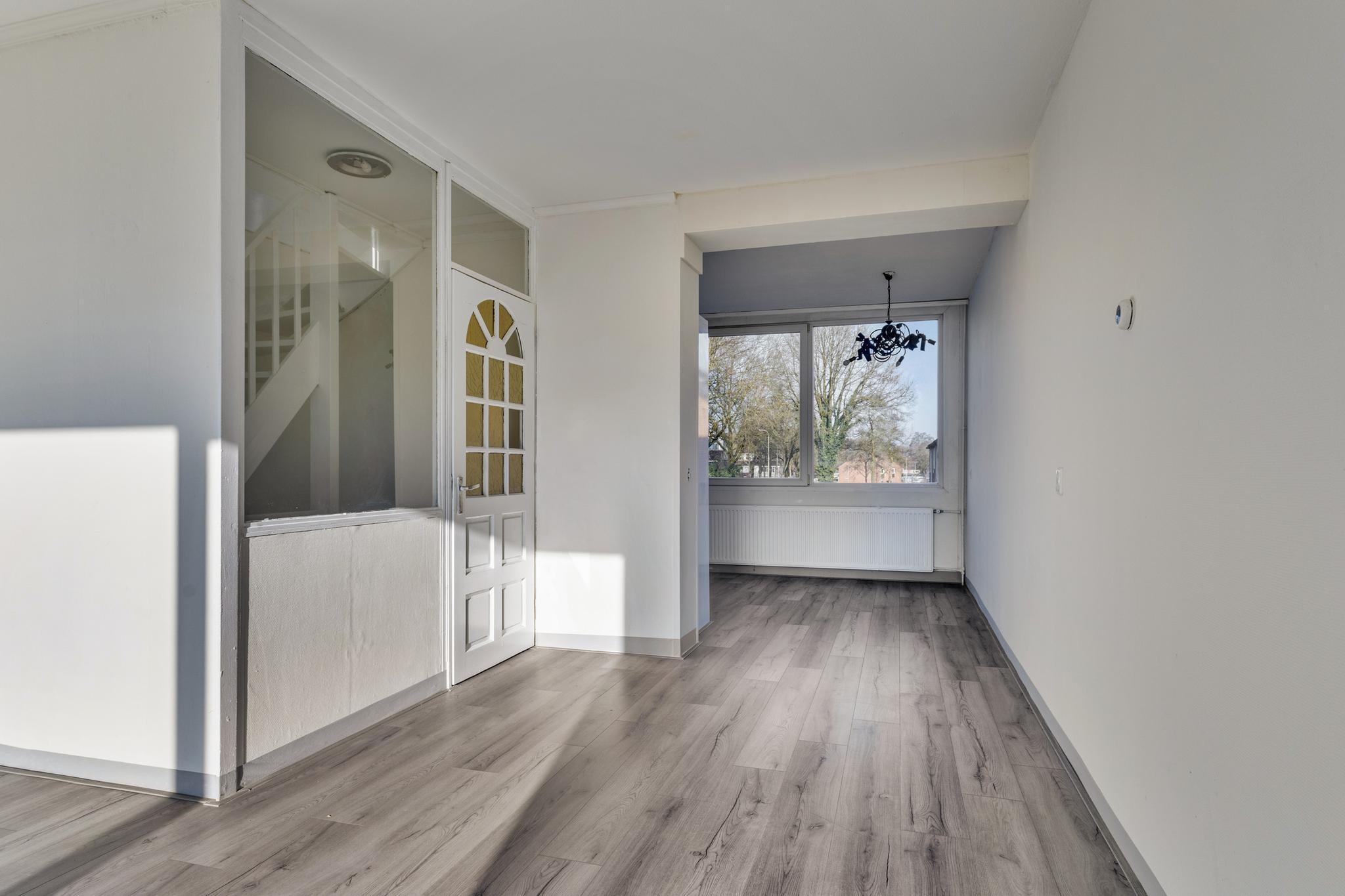 Hier vind je een heerlijk ruime woonkamer waar je alle kanten mee op kunt. Of je nu een grote zithoek wilt of ruimte zoekt voor een lange eettafel, hier kan het allemaal! Aansluitend ligt de keuken, die echt aan vervanging toe is – een mooie kans om er iets totaal naar eigen smaak van te maken.