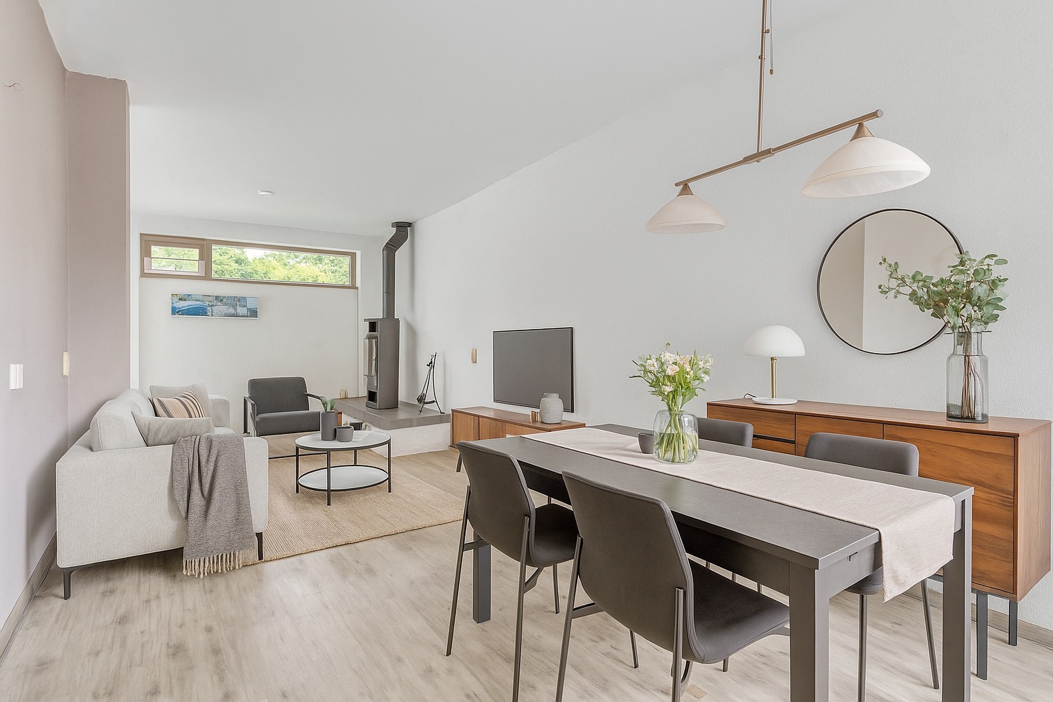 Via de hal met toilet en trapopgang kom je in de ruime woonkamer (ca. 40 m²) met de gezellige houtkachel als eyecatcher. Dankzij de grote ramen is er veel licht en sfeer. Aansluitend vind je de moderne keuken in hoekopstelling, voorzien van de nodige inbouwapparatuur.