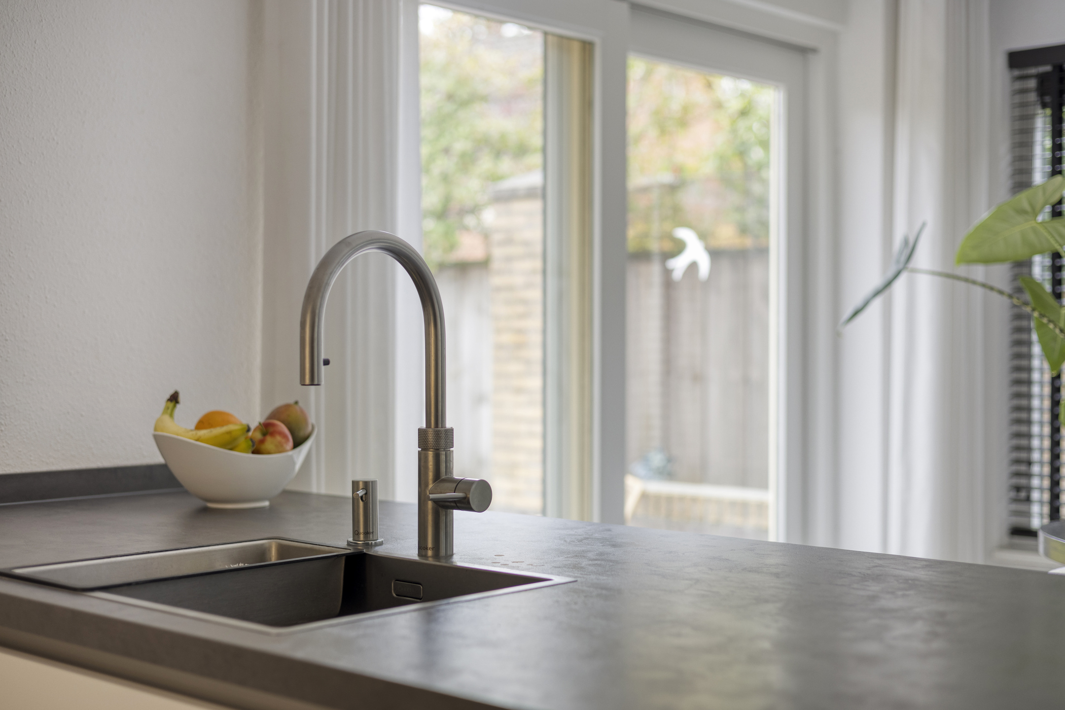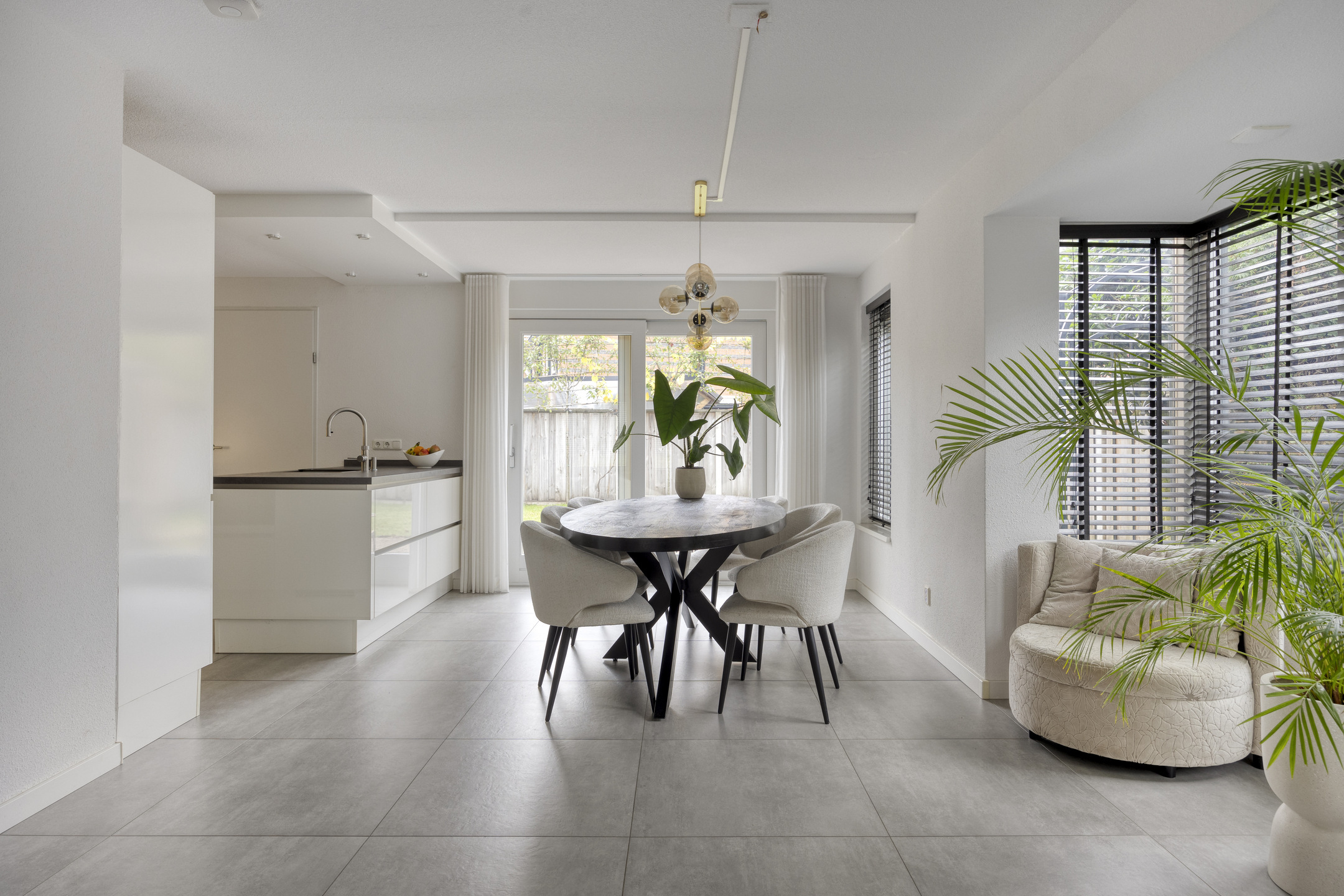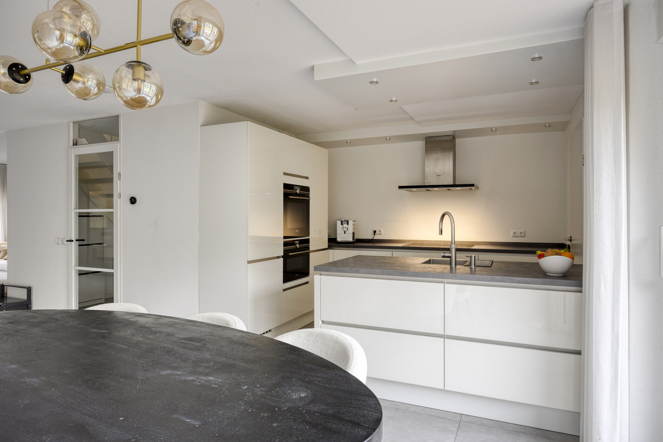De woonkeuken is een echte eyecatcher – luxe uitgevoerd, met moderne inbouwapparatuur, een sfeervolle erker en dubbele terrasdeuren naar de tuin.