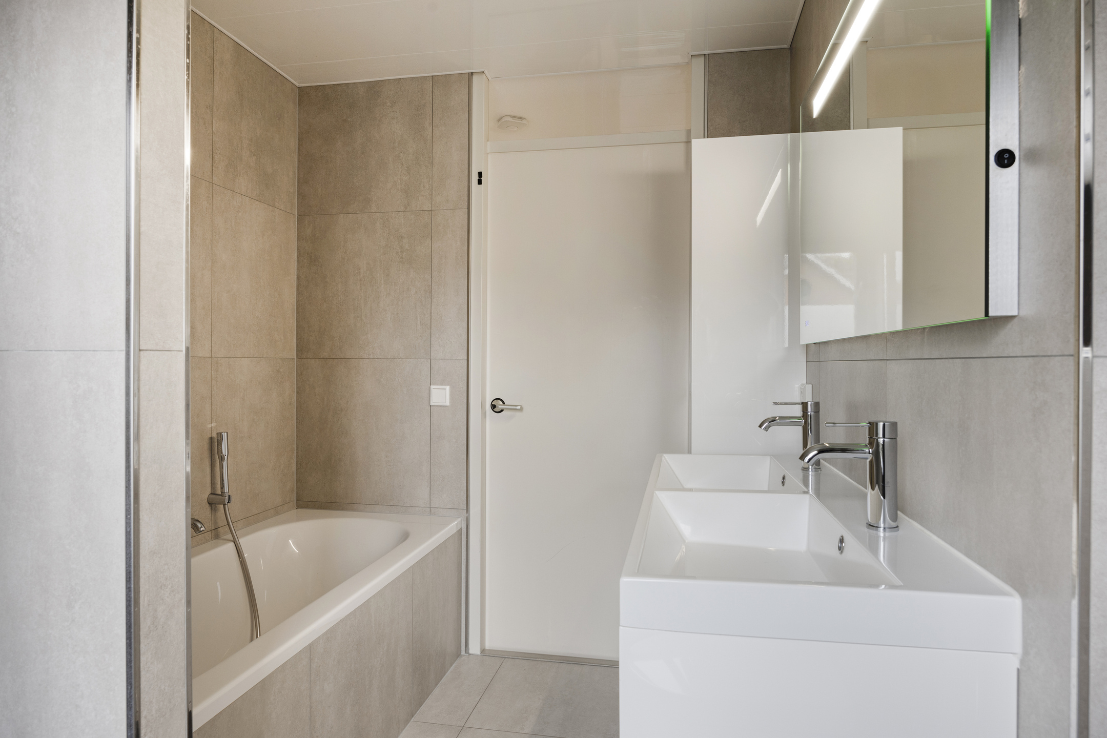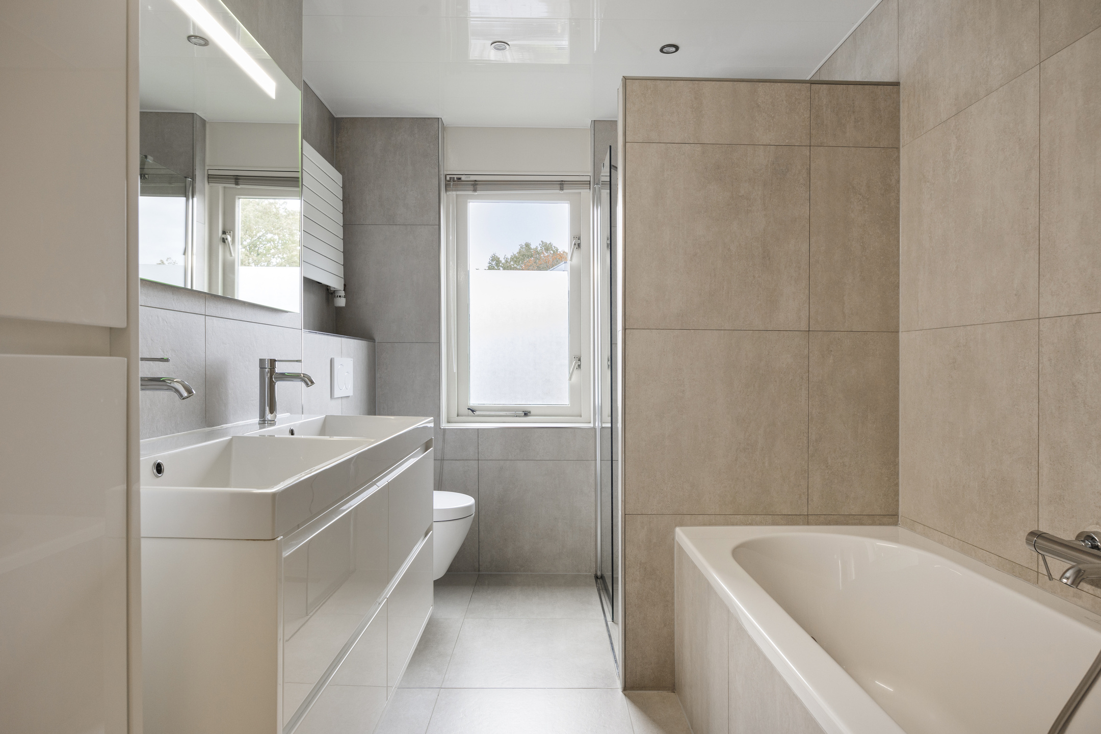 – Moderne badkamer met bad, douche, toilet en dubbele wastafel