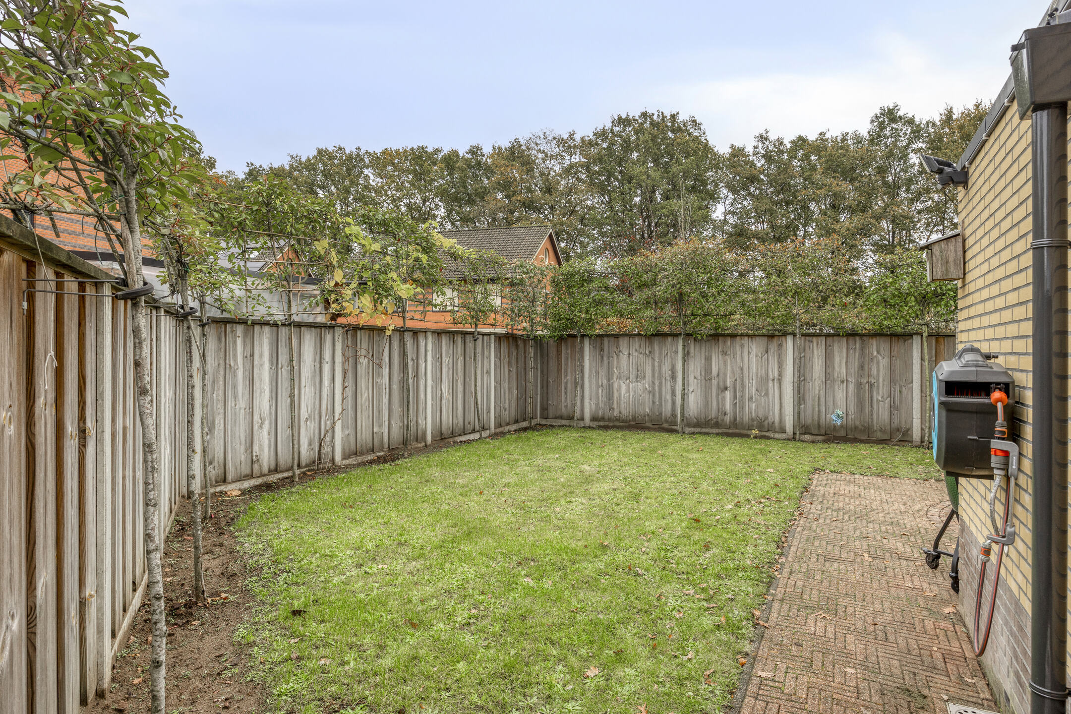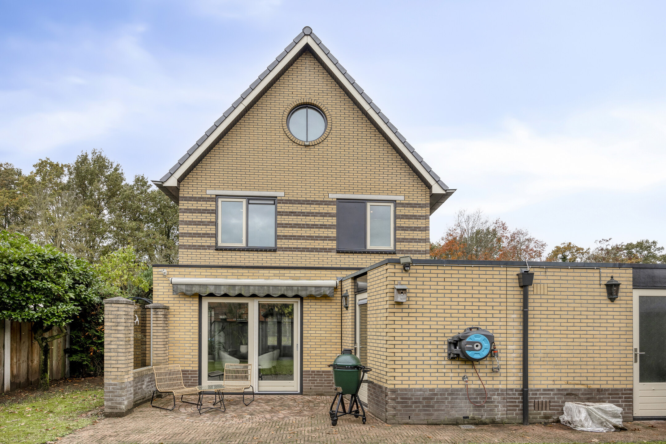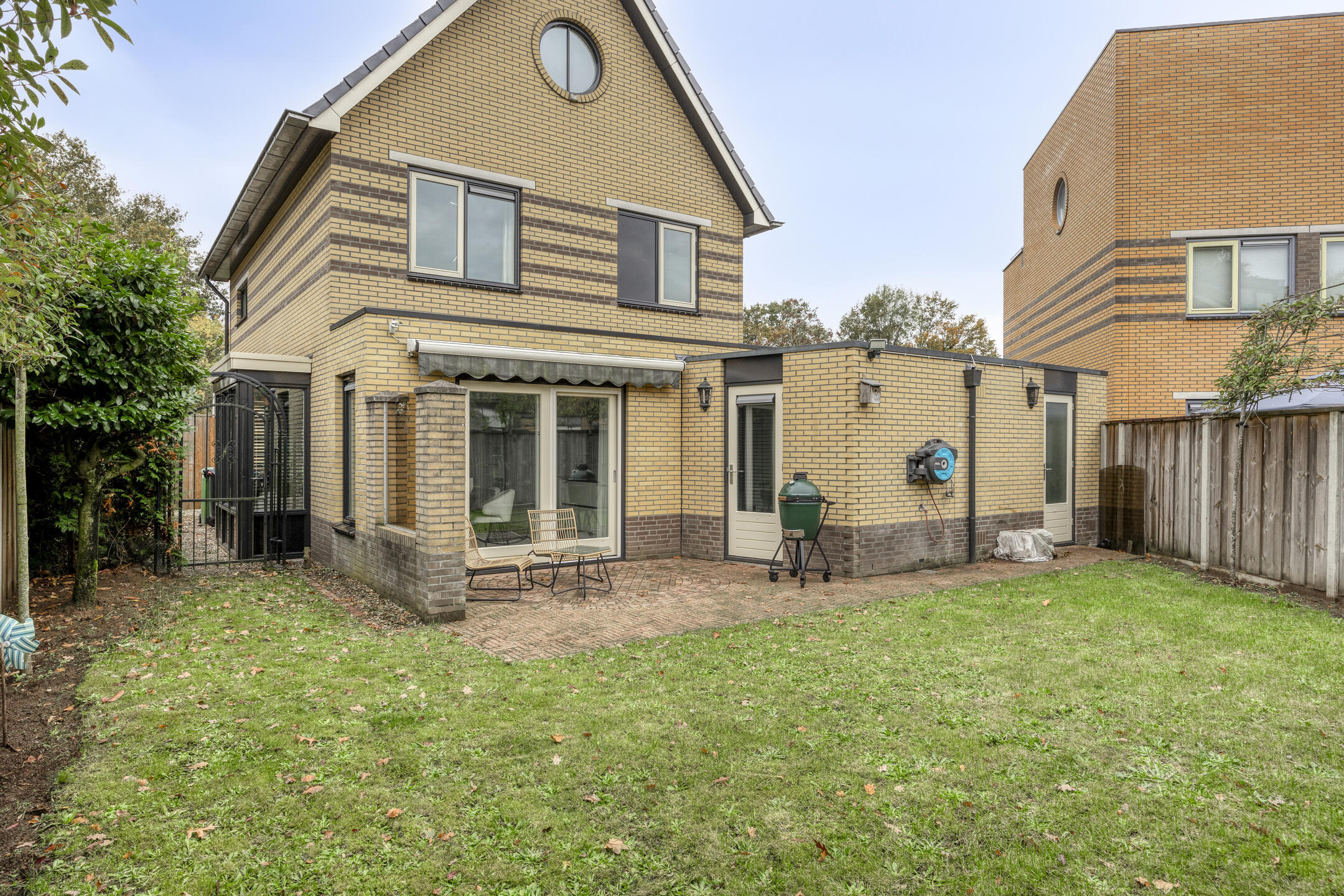 Een onderhoudsarme tuin waarbij de achtertuin is georiënteerd op het noordoosten en de ruime voortuin op het zuidwesten. Op ieder moment van de dag is er een fijne plek in de zon te vinden.