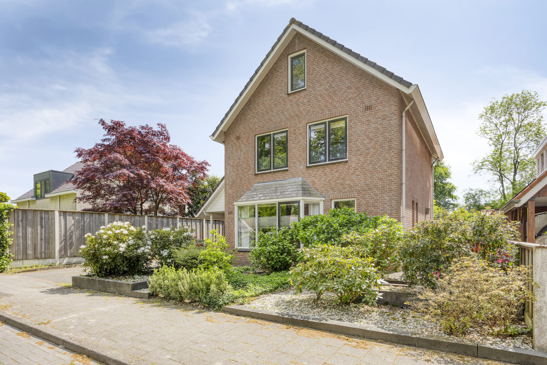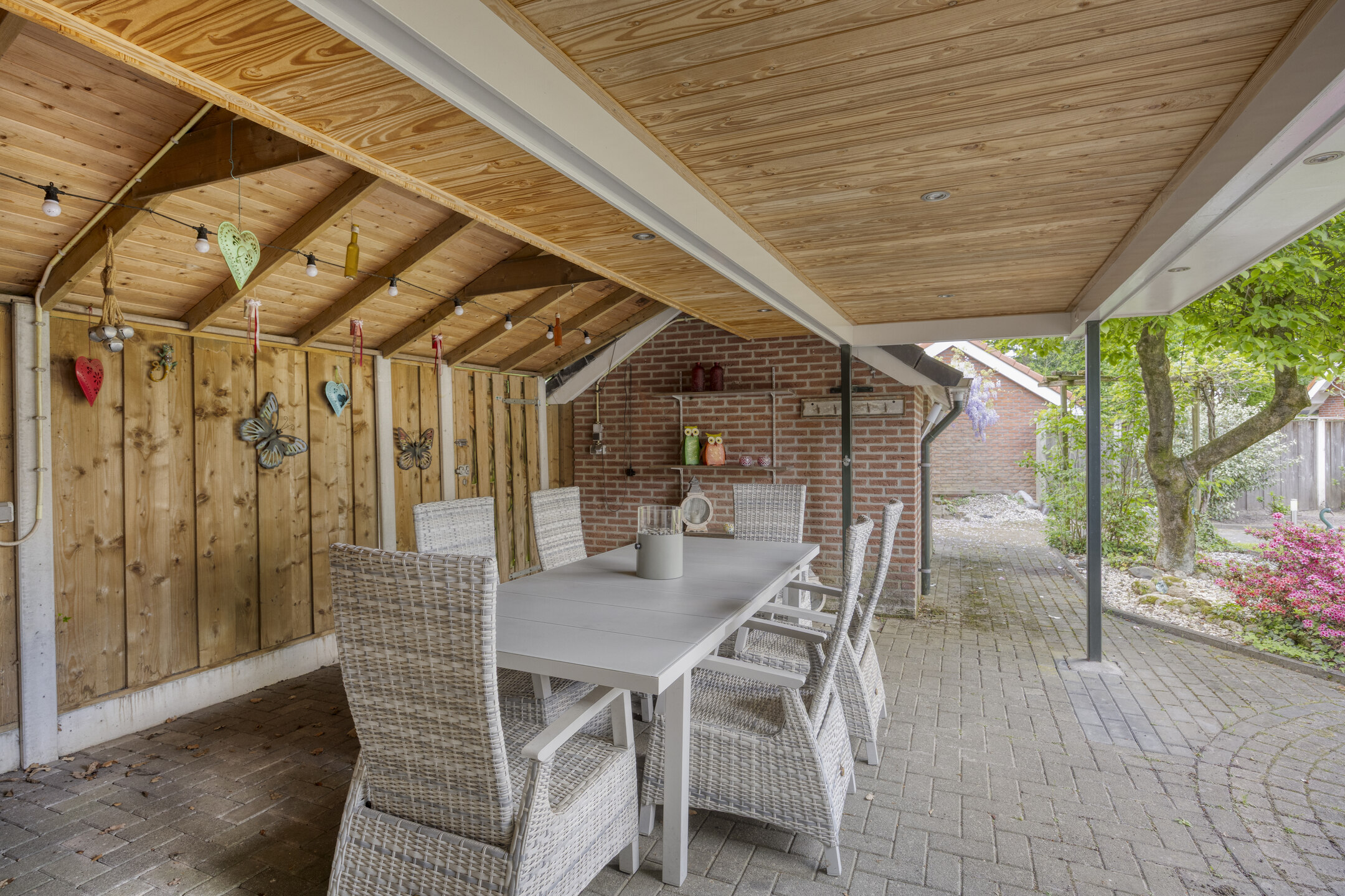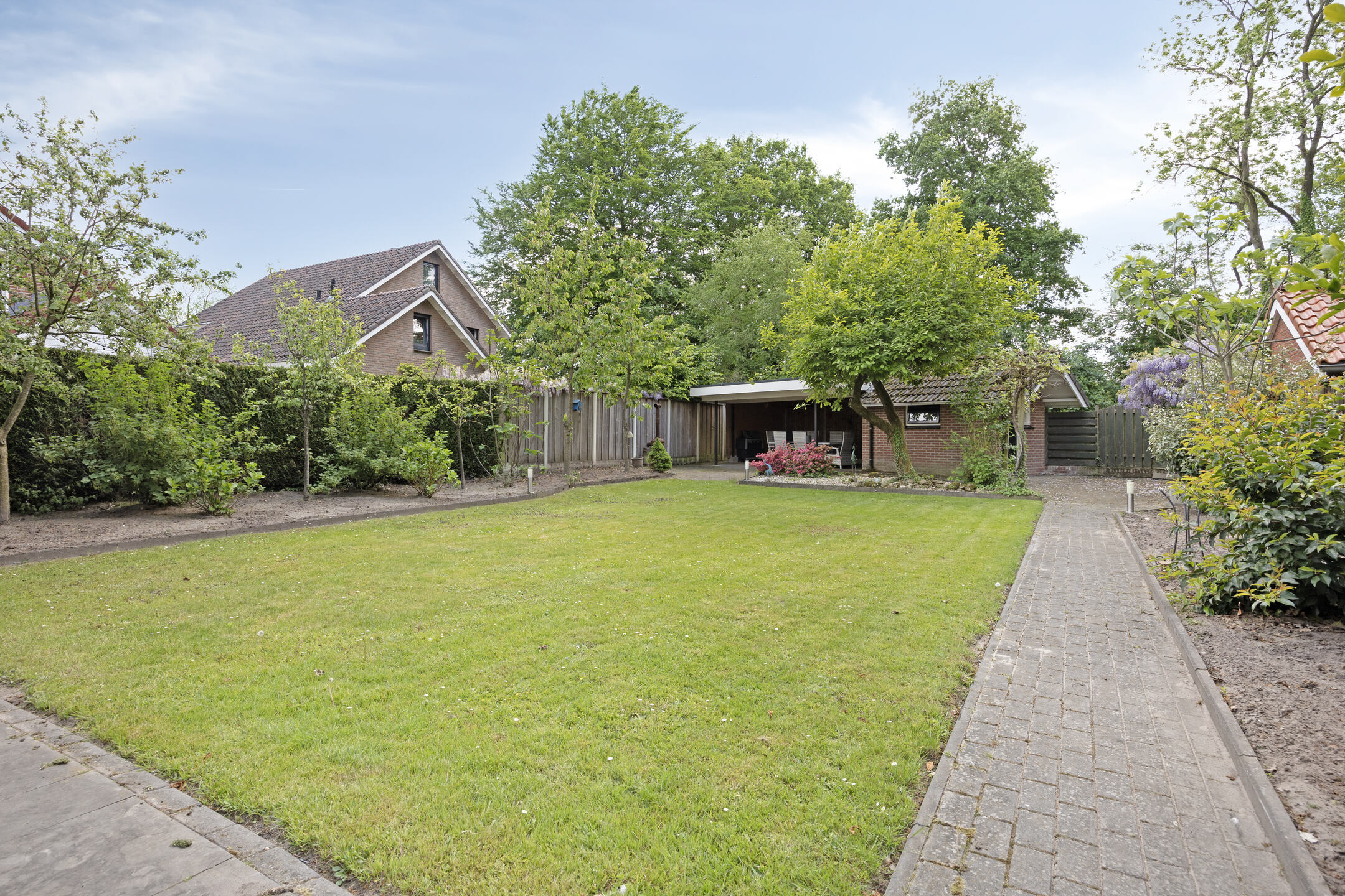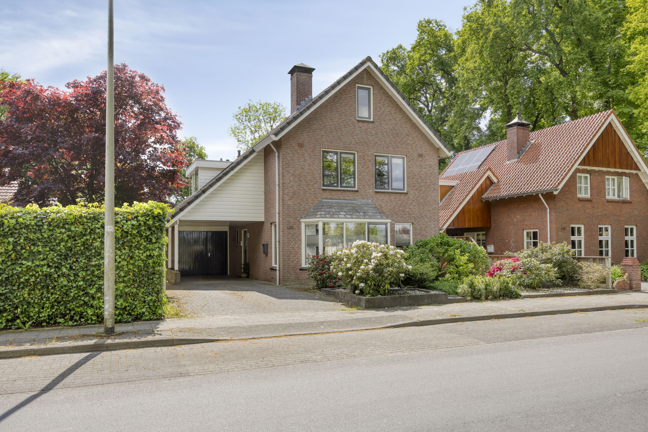 Je parkeert gewoon op eigen terrein, lekker droog onder de carport. De lange oprit biedt plek voor meerdere auto’s. Aan de voorzijde van het huis ligt een prachtige siertuin en de doorgetrokken kap boven de garage geeft het geheel net wat extra uitstraling.