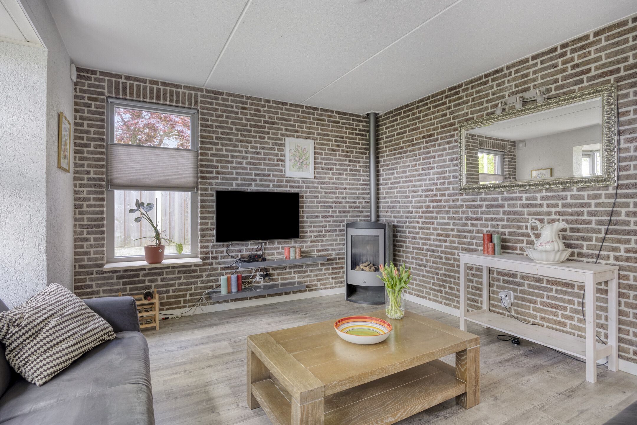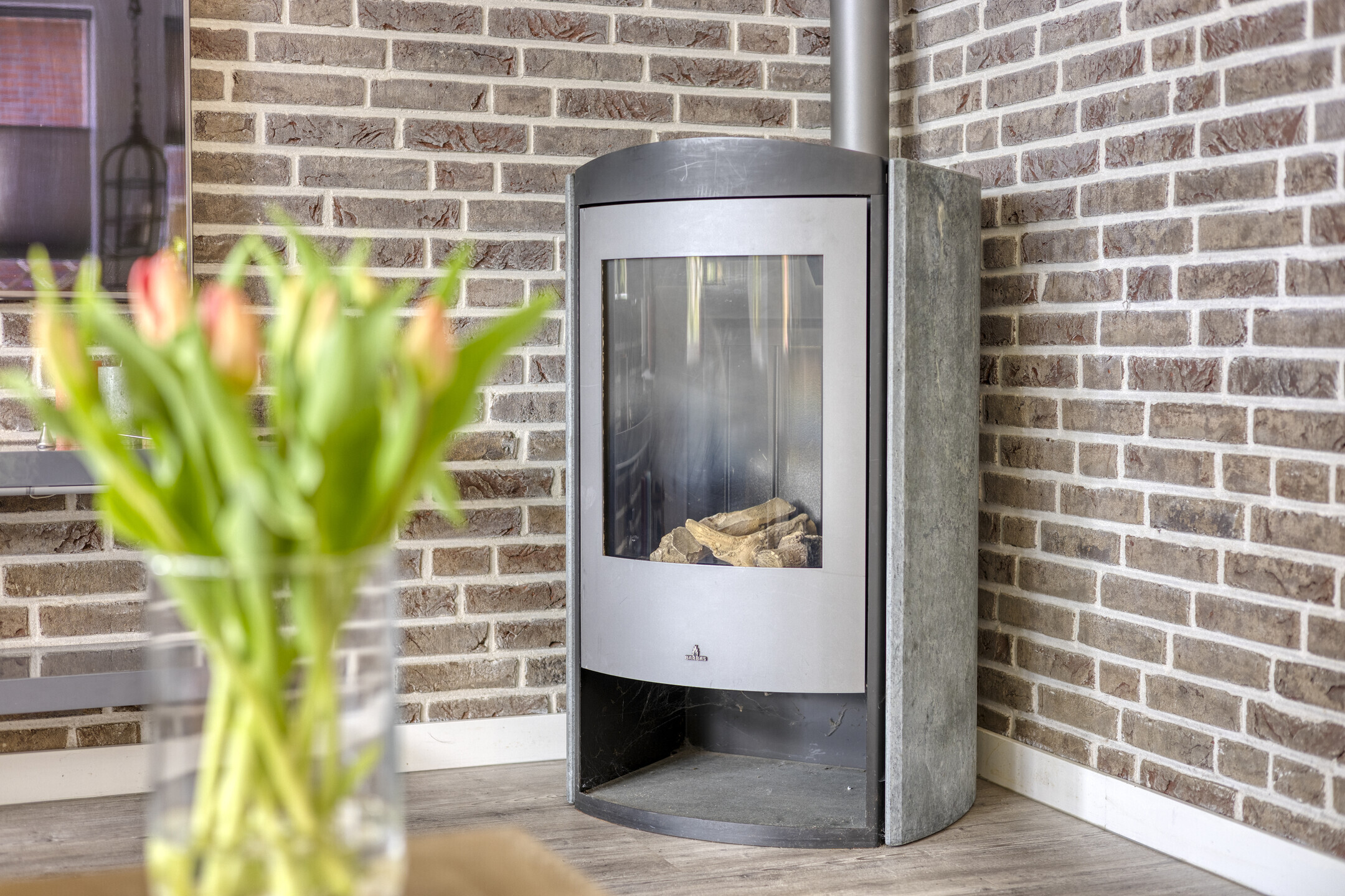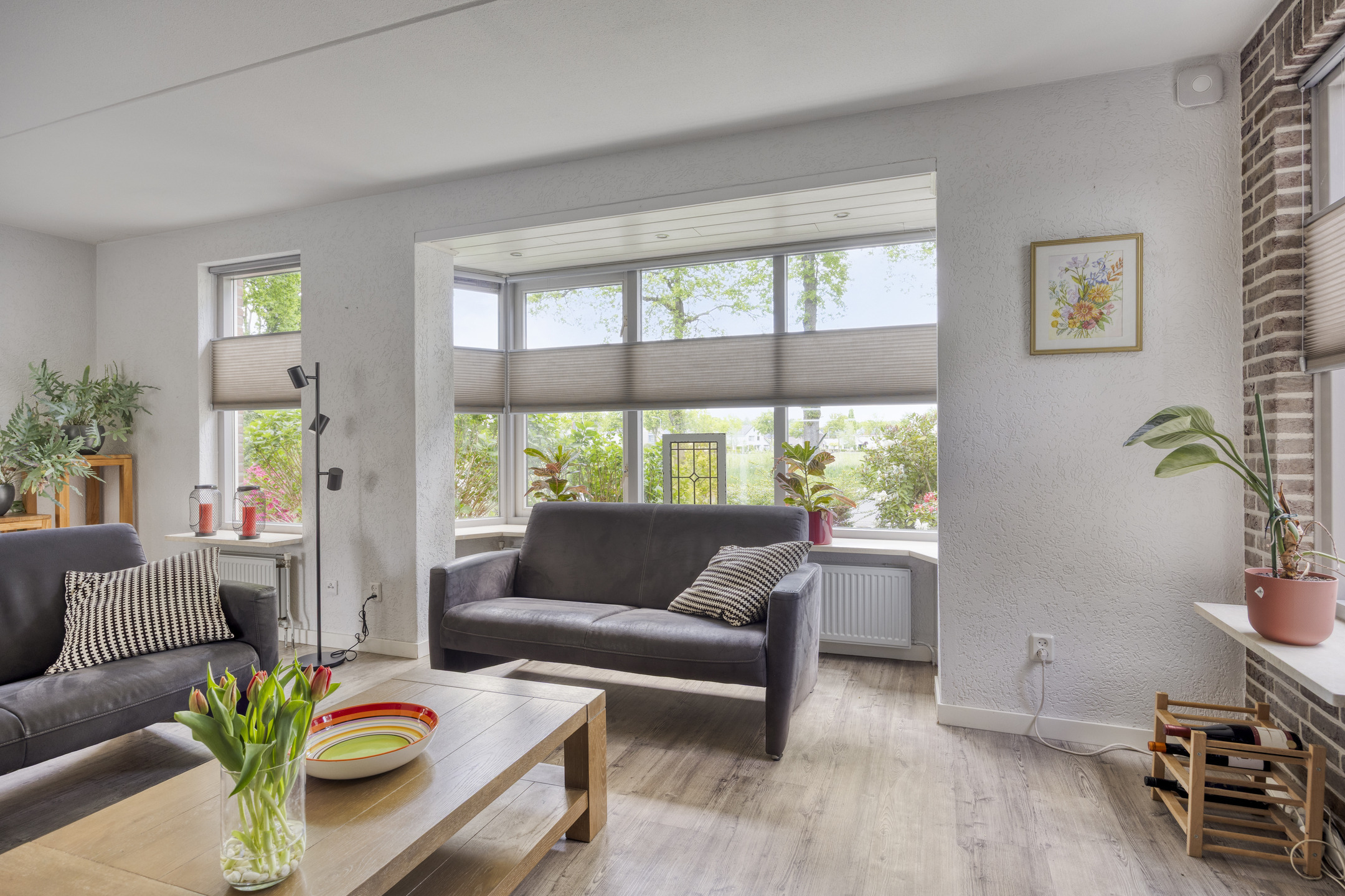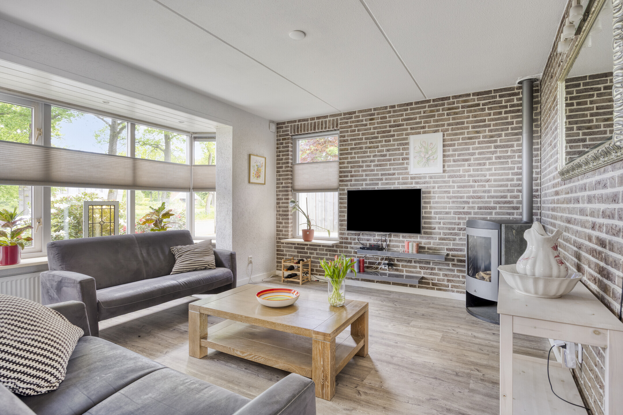 * Riante living met erker en houtkachel