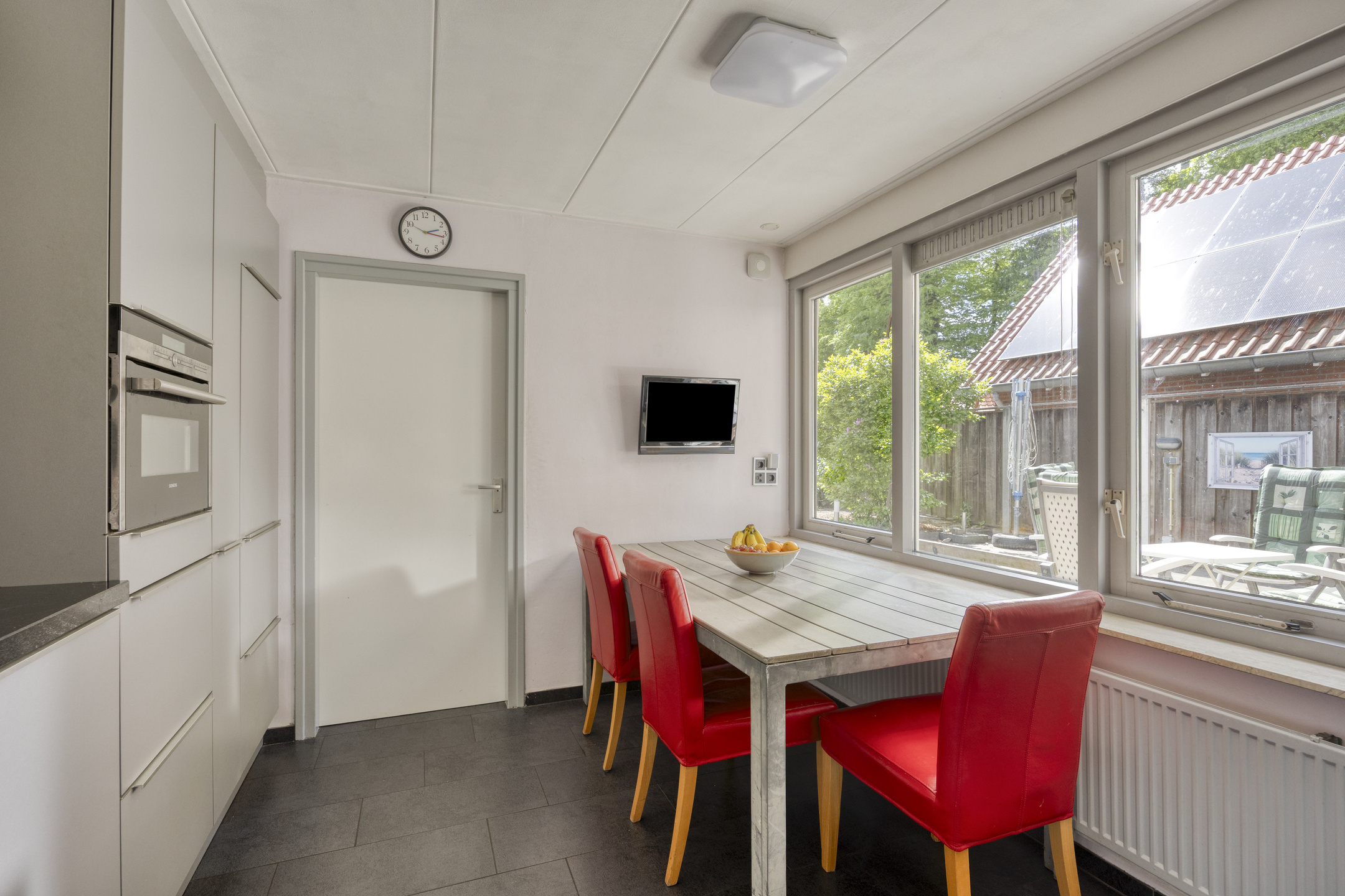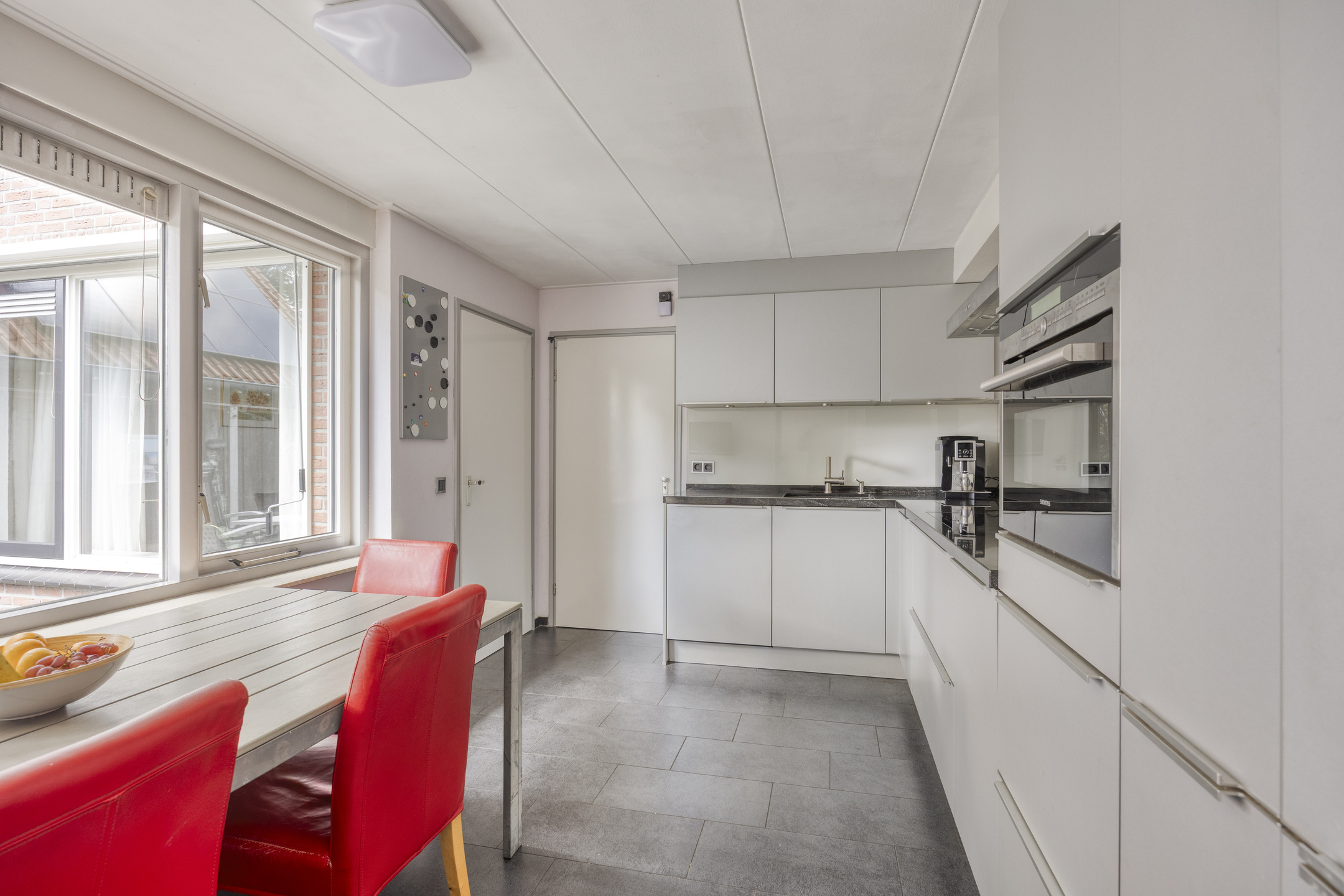 Met z’n 43 m² is deze woonkamer heerlijk ruim. De grote raampartijen, sfeervolle erker en gezellige gaskachel zorgen voor veel licht en warmte. De zithoek ligt aan de voorkant, terwijl de eethoek uitkijkt op de tuin. Of je eet lekker in de ruime woonkeuken, compleet met een granieten aanrechtblad, veel werk- en opbergruimte én alle inbouwapparatuur die je nodig hebt: inductiekookplaat, afzuigkap, vaatwasser, combimagnetron en koelkast.