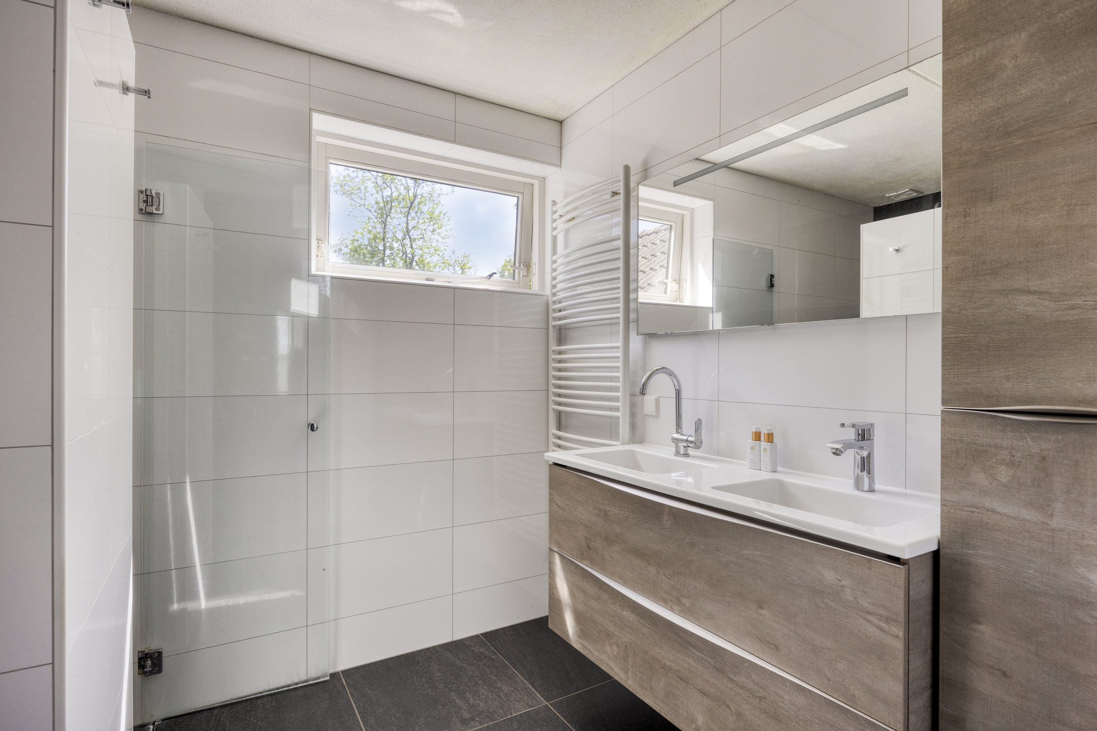 Op de eerste verdieping zijn vier ruime slaapkamers, een extra werkkamer, een handige bergruimte én een moderne badkamer met vloerverwarming, een dubbel wastafelmeubel, tweede toilet en handdoekradiator.