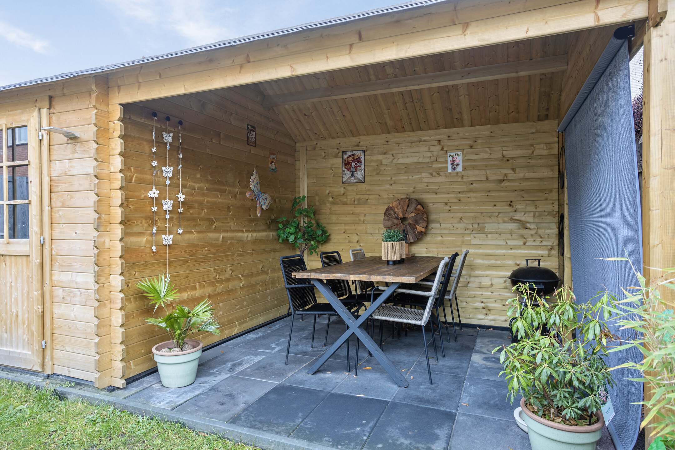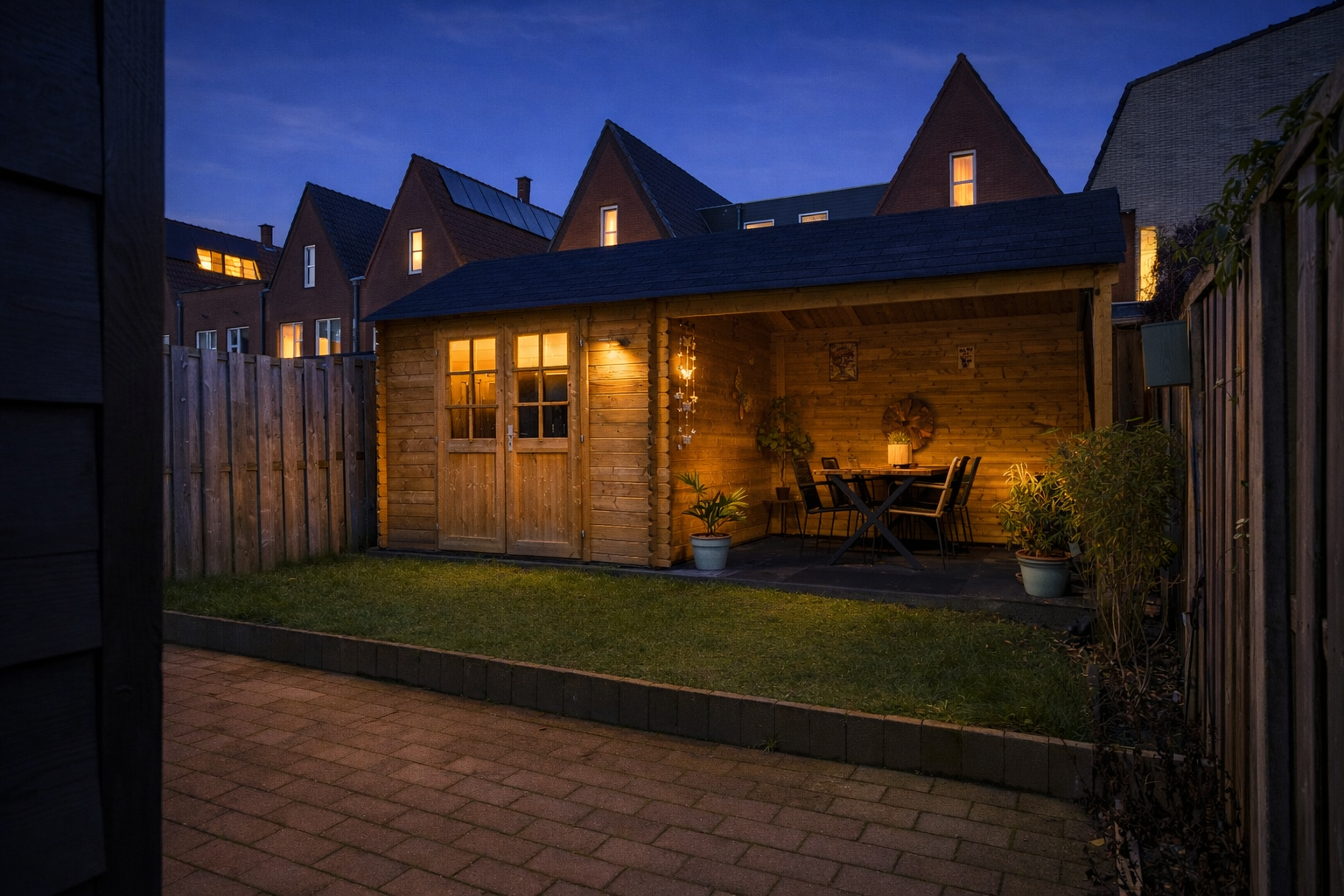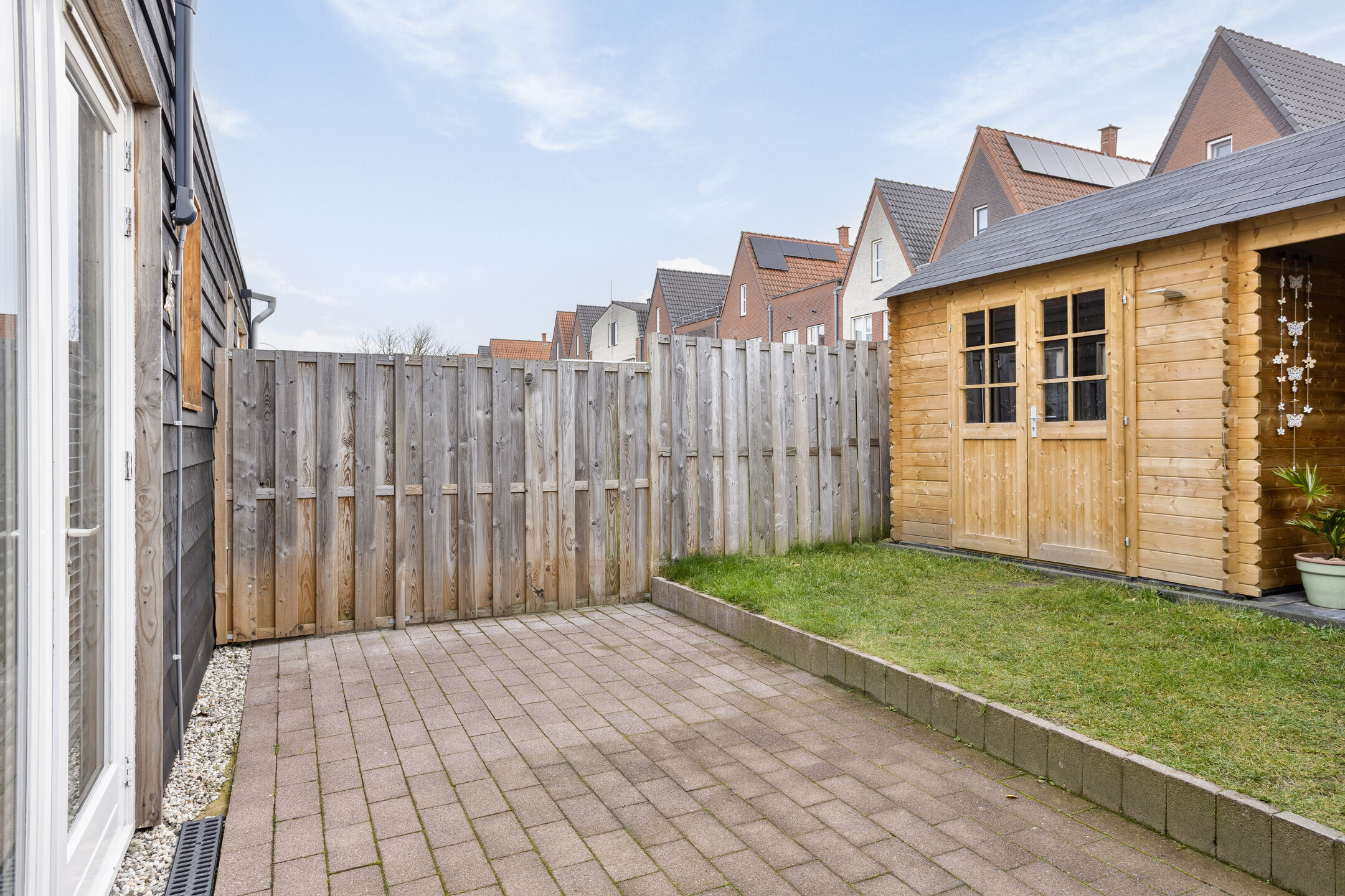 Een zonnige op het zuiden georiënteerde achtertuin met berging en overkapping.