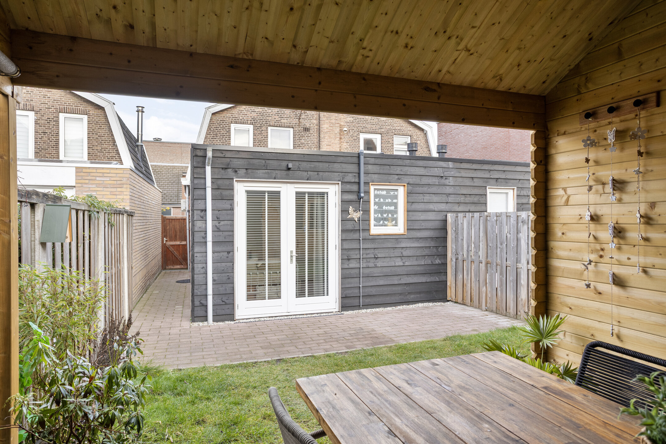 De achtertuin ligt op het zuiden en biedt veel privacy. Onder de overkapping is het prettig buiten zitten, ook in de avonduren. Daarnaast is er een aangebouwde berging voor fietsen en extra opslag.