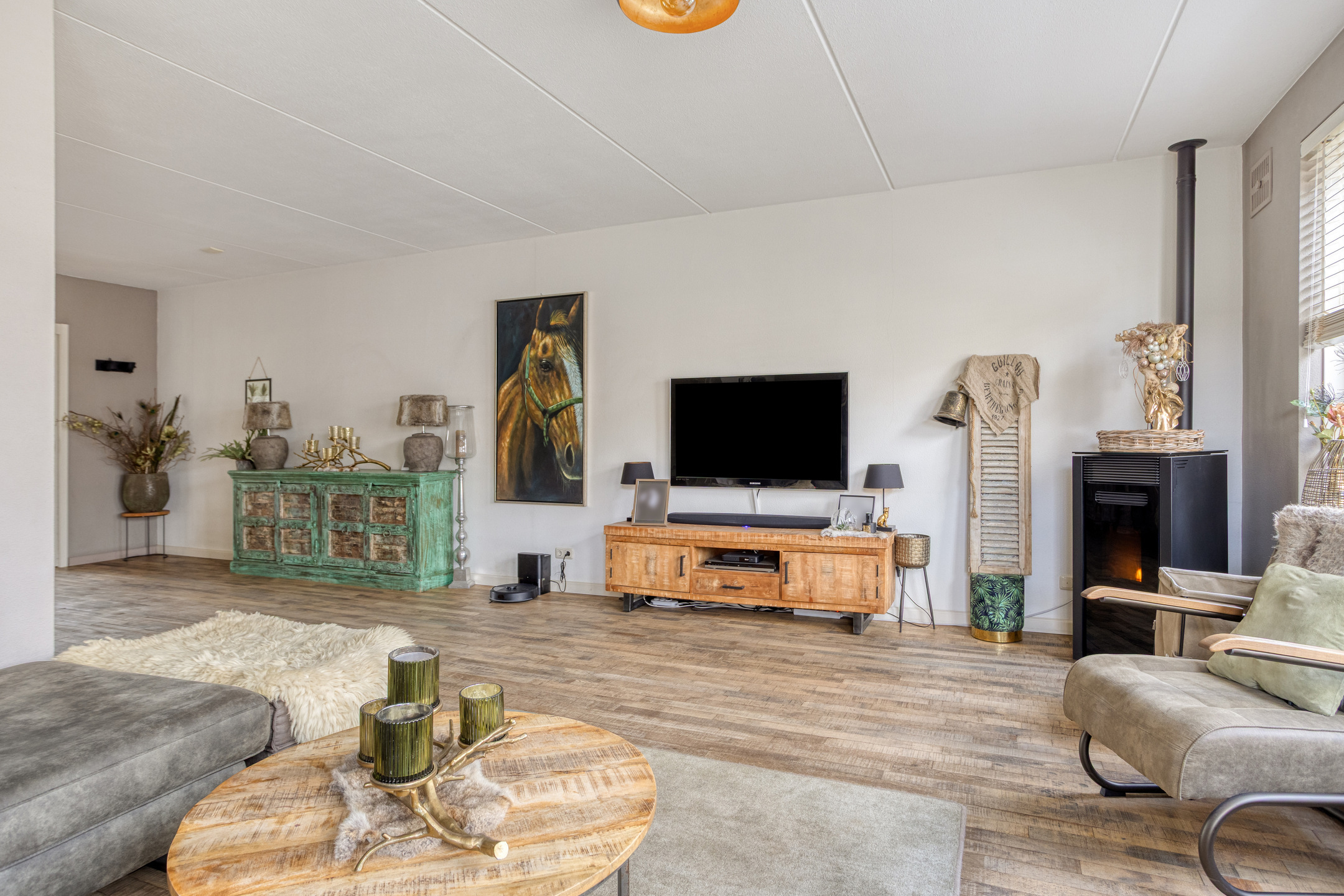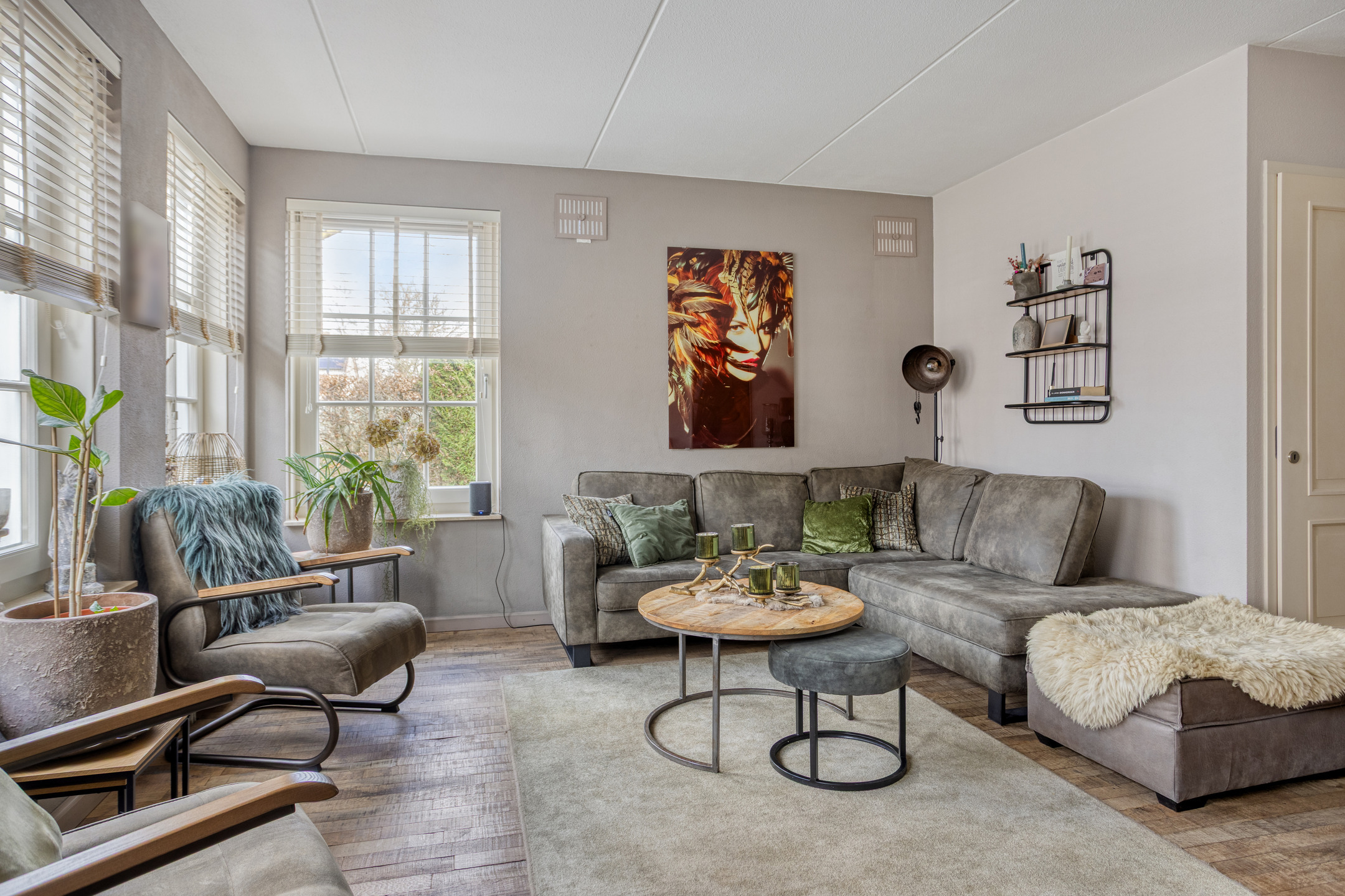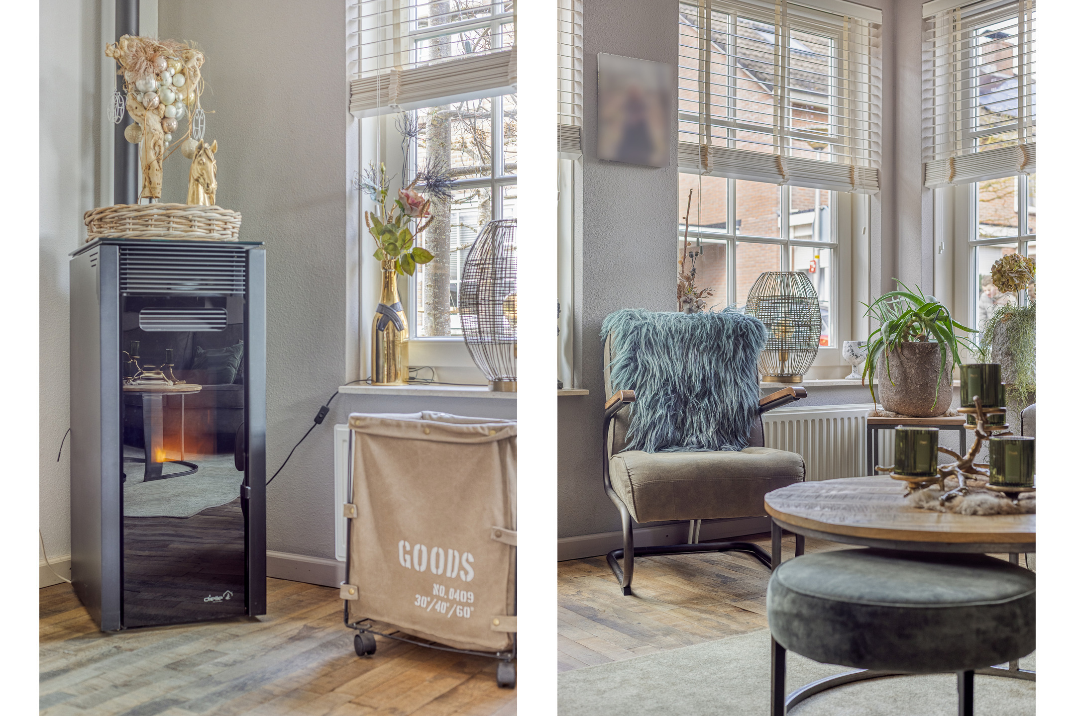 De houten vloer loopt door naar de sfeervolle en royale woonkamer (ca. 40 m²). Dankzij de grote raampartijen met roeden is er volop lichtinval, wat zorgt voor een warme en uitnodigende sfeer. De pelletkachel maakt het geheel extra gezellig.
