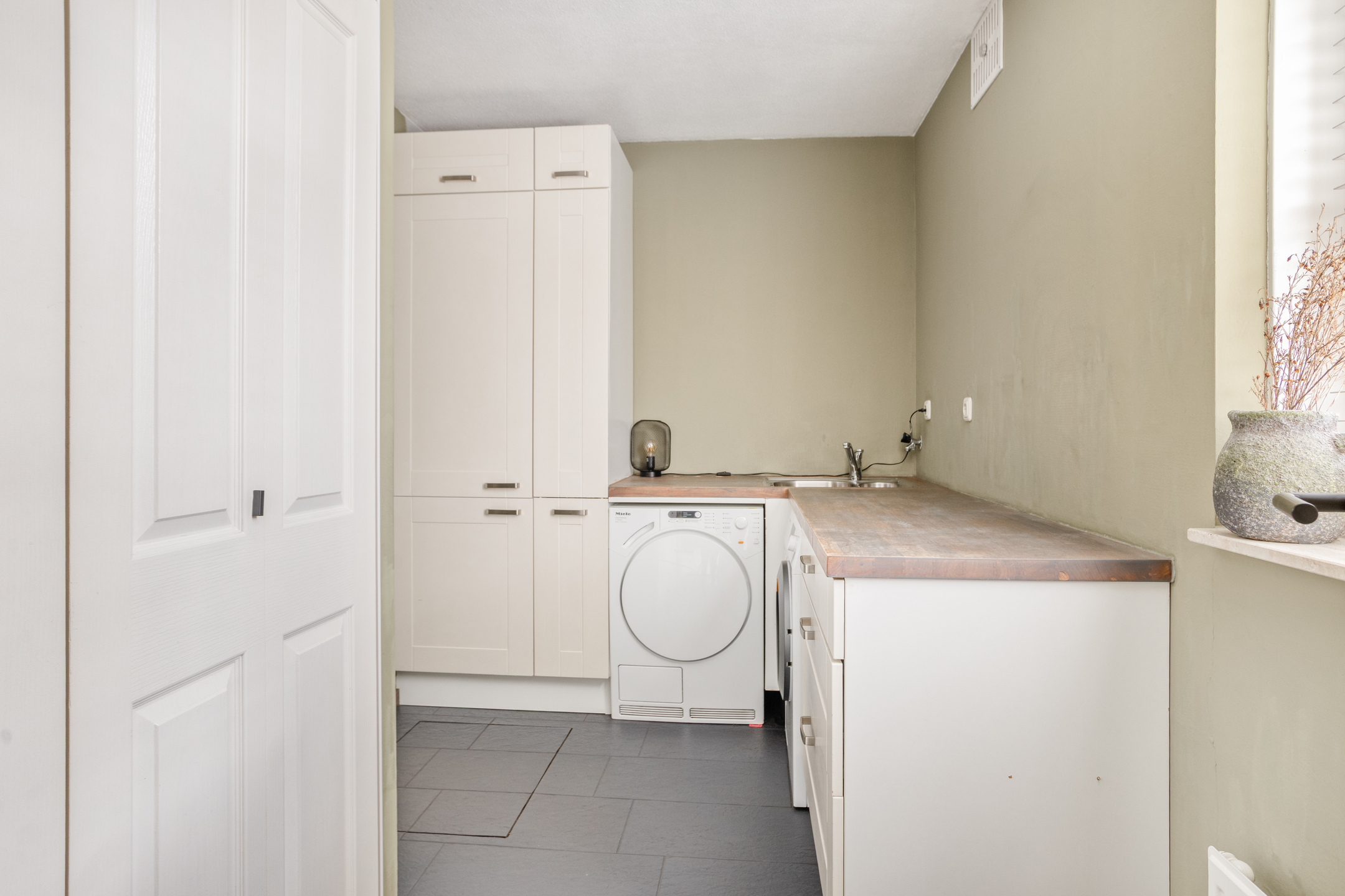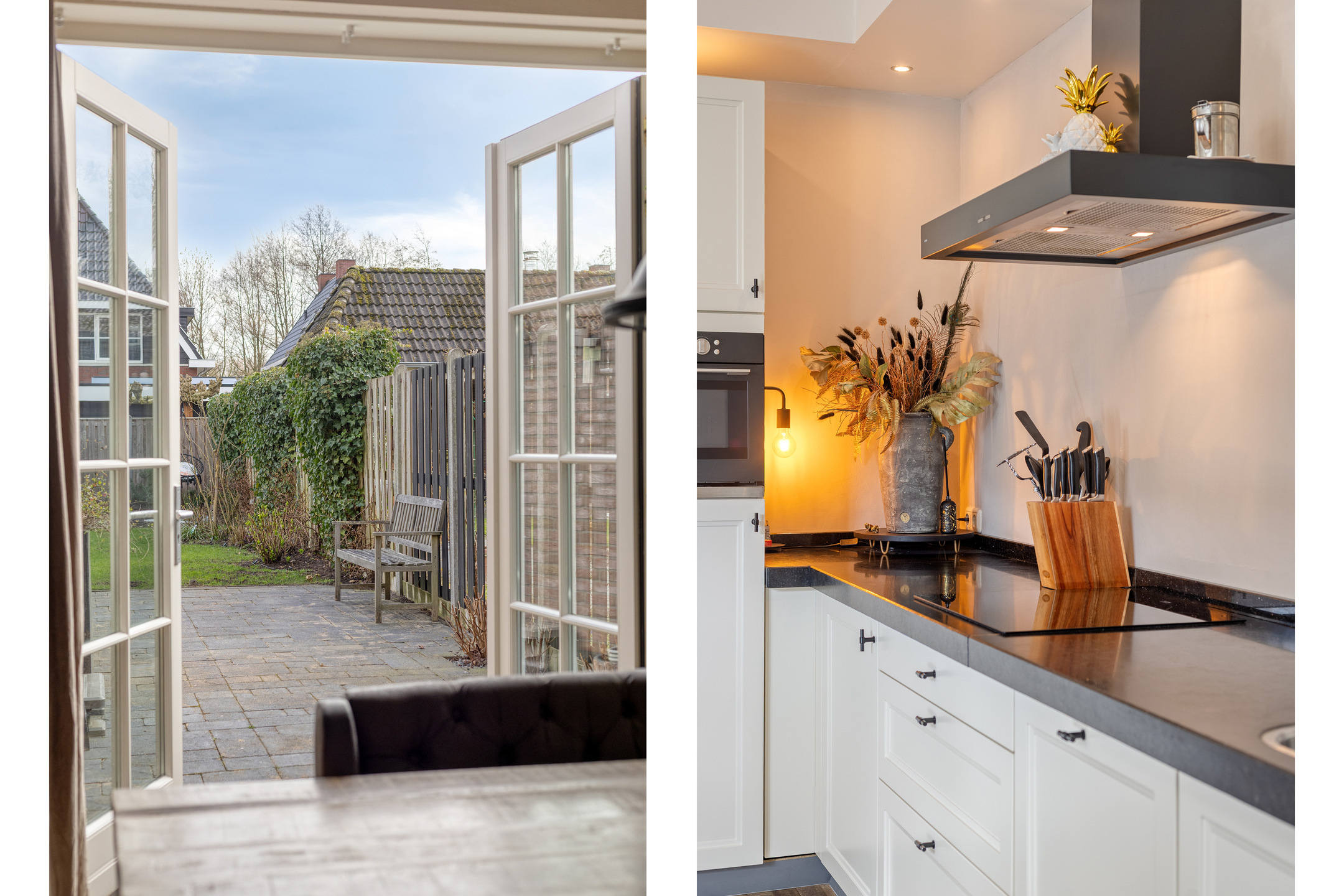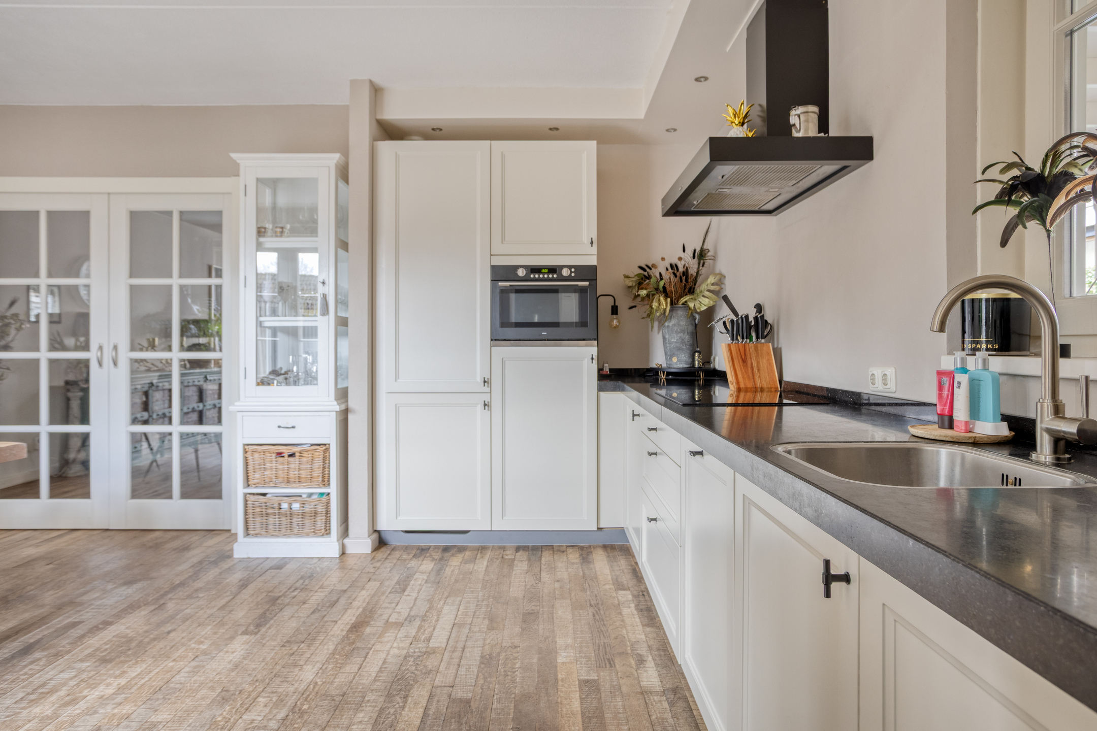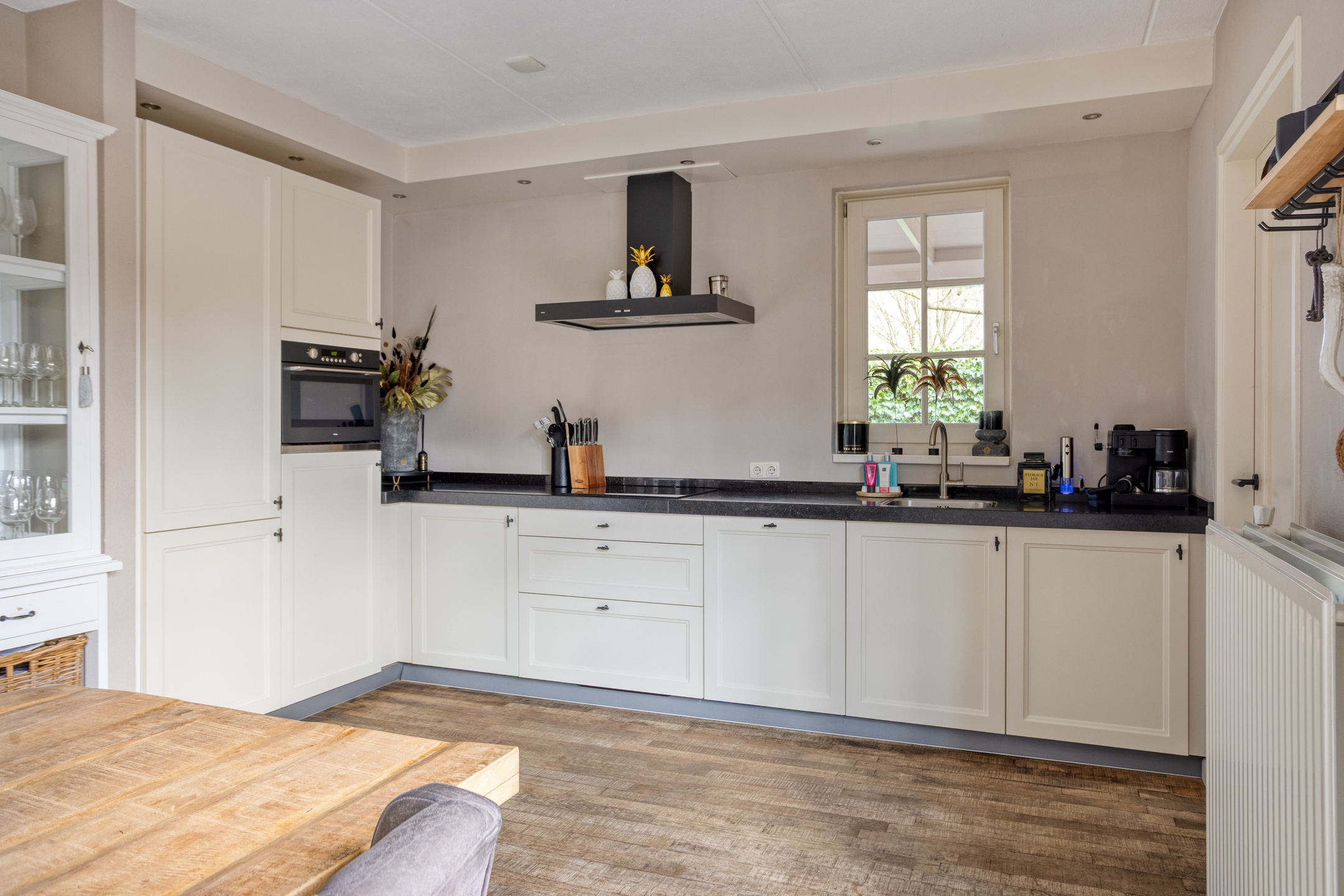 Via ensuite deuren bereik je de ruime woonkeuken. Deze moderne leefkeuken is uitgevoerd met een granieten werkblad en diverse inbouwapparatuur, waaronder een inductiekookplaat, afzuigkap, combi-magnetron, koelkast, vriezer en vaatwasser. De openslaande tuindeuren zorgen voor een fijne verbinding met het terras. Aansluitend vind je een praktische bijkeuken met keukenblok en toegang tot de inpandige berging.