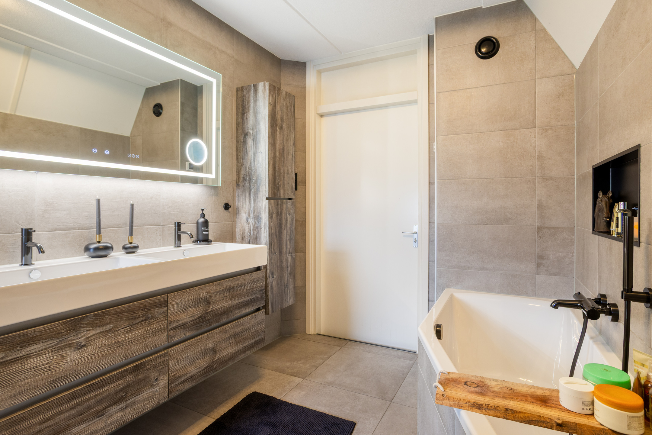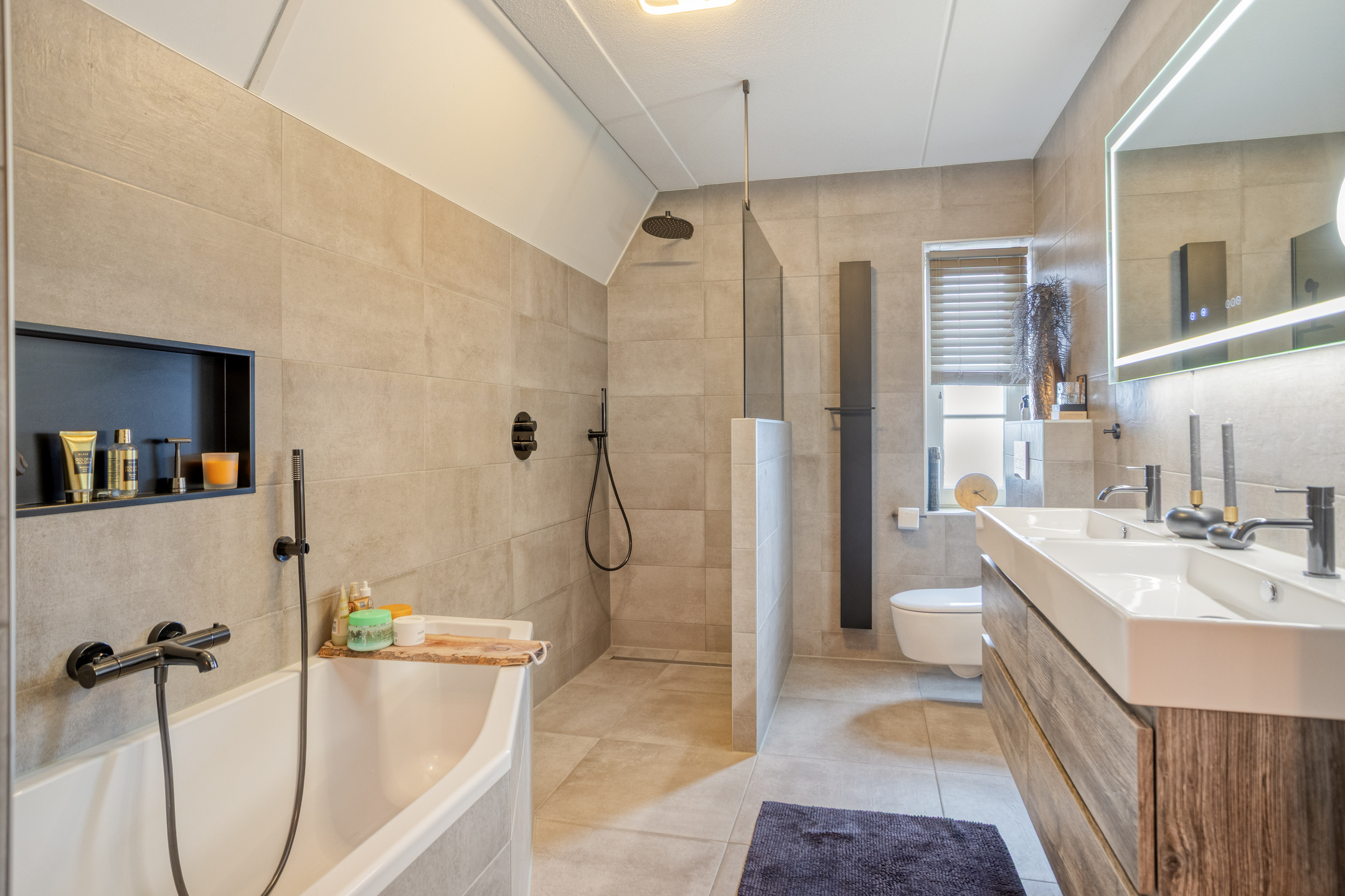 Op de eerste verdieping bevinden zich drie ruime slaapkamers, waaronder een royale ouderslaapkamer met airconditioning en inloopkast. De luxe, moderne badkamer is compleet uitgerust met een ligbad, inloopdouche, dubbel wastafelmeubel, tweede toilet en vloerverwarming.