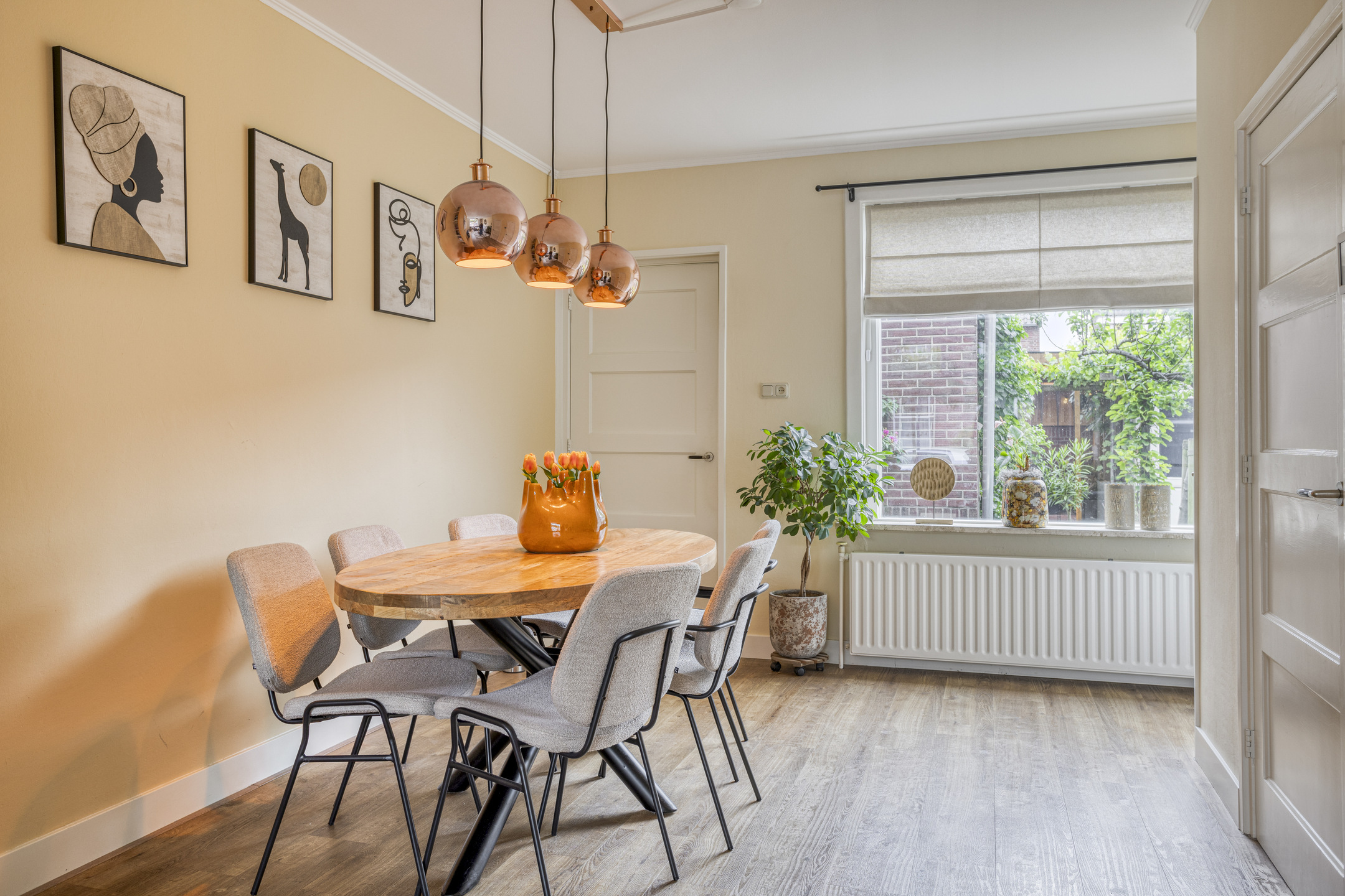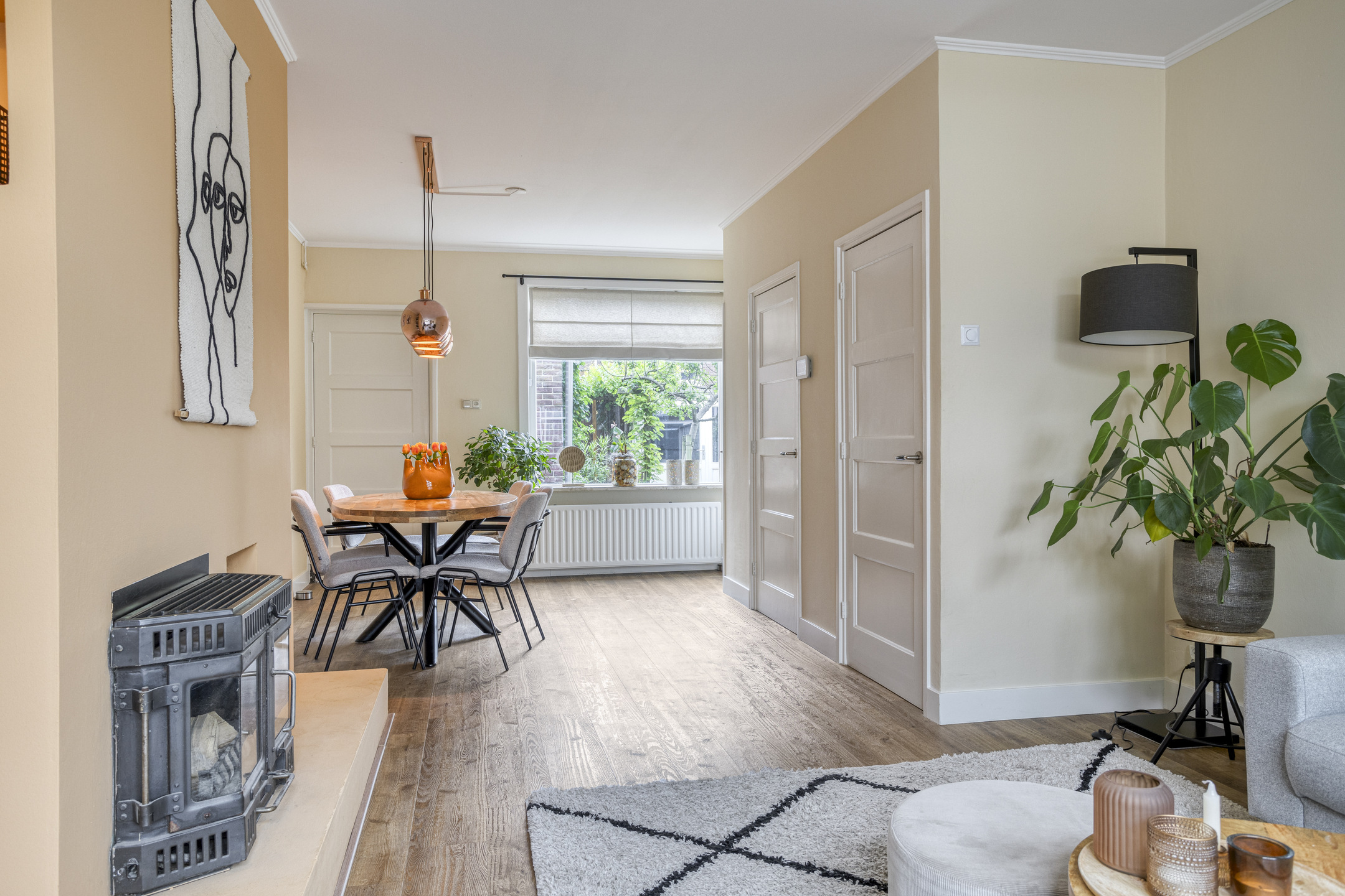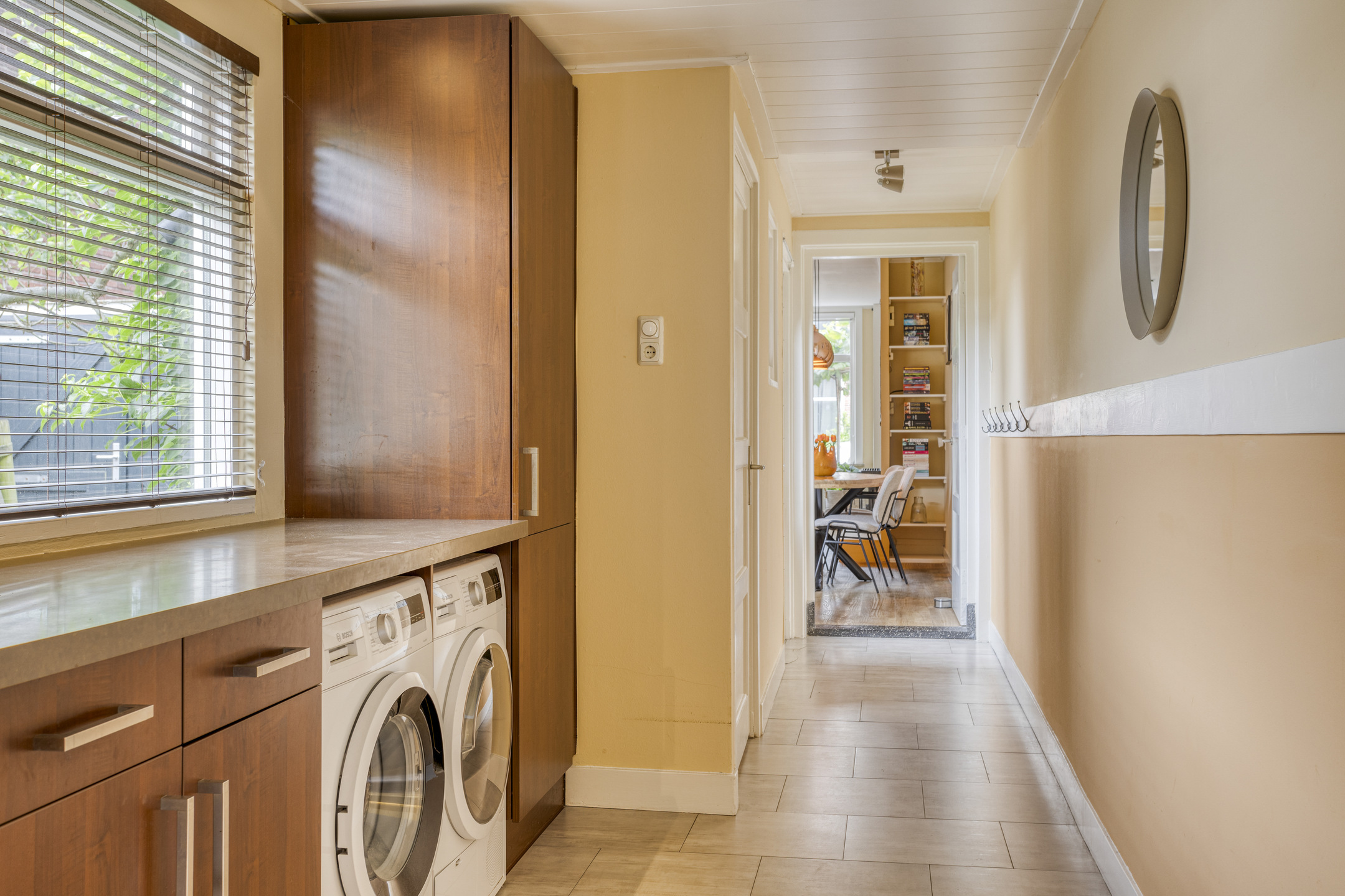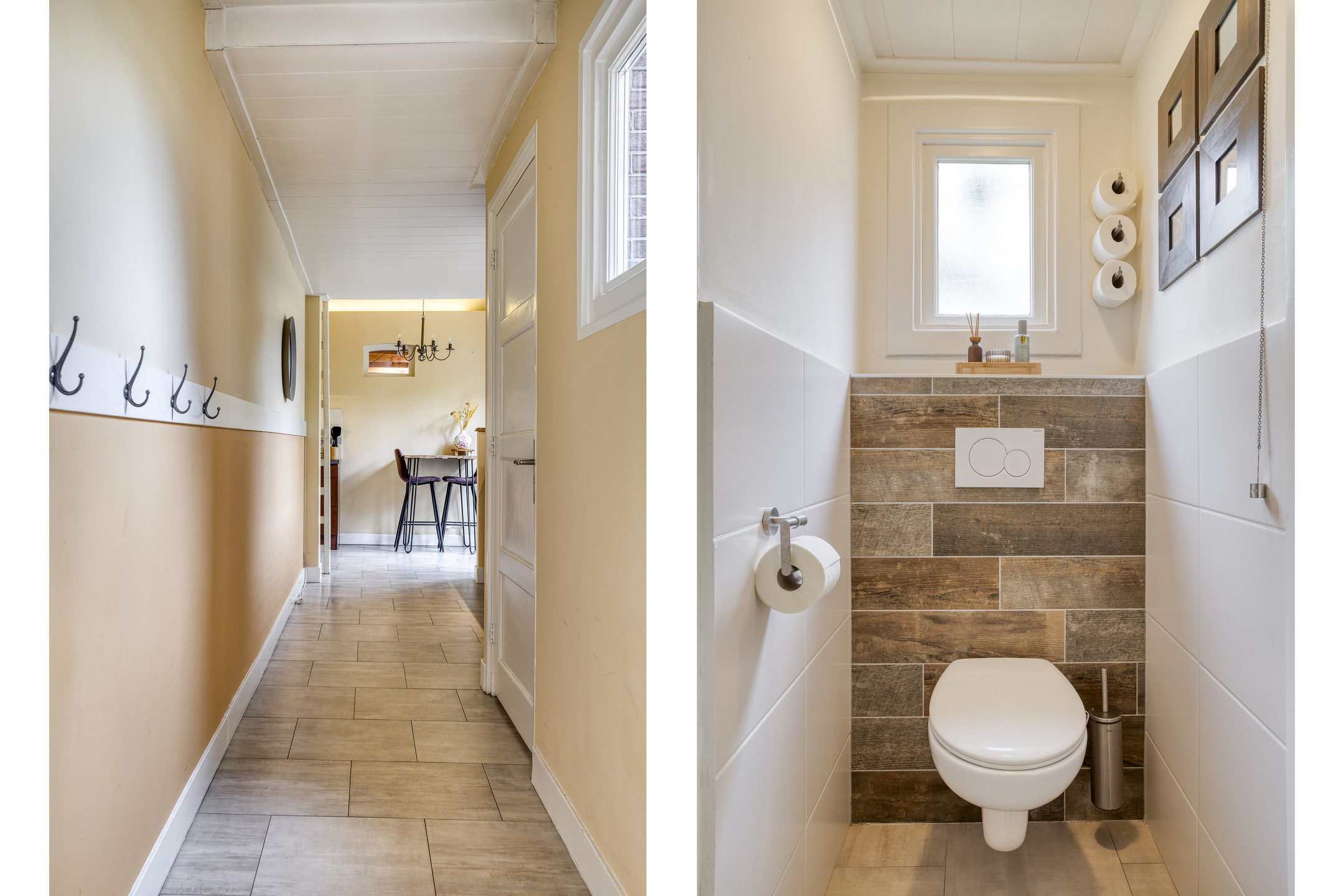 Entree, hal, doorgang naar de ruime keurig verzorgde woon/eetkamer met openhaard. Doordat aan beide zijden grote ramen aanwezig zijn is de lichtinval optimaal. Aansluitend de hal/bijkeuken met toegang tot de tuin. Hier is ook het keurig gemoderniseerde toilet gesitueerd. In deze ruime doorgang naar de keuken is een extra keukenblok geplaatst met de opstelplaats voor de wasautomaat, een extra werkblad en veel bergruimte. Aan het einde van deze hal is de keuken geplaatst, door de hoogte in de keuken wordt het ruimtelijke gevoel extra versterkt. De goede onderhouden keuken is voorzien van diverse apparaten. In de keuken is ruimte voor een ontbijtplek. De keuken is voorzien van terrasdeuren waardoor de tuin en overkapping makkelijk te bereiken zijn.