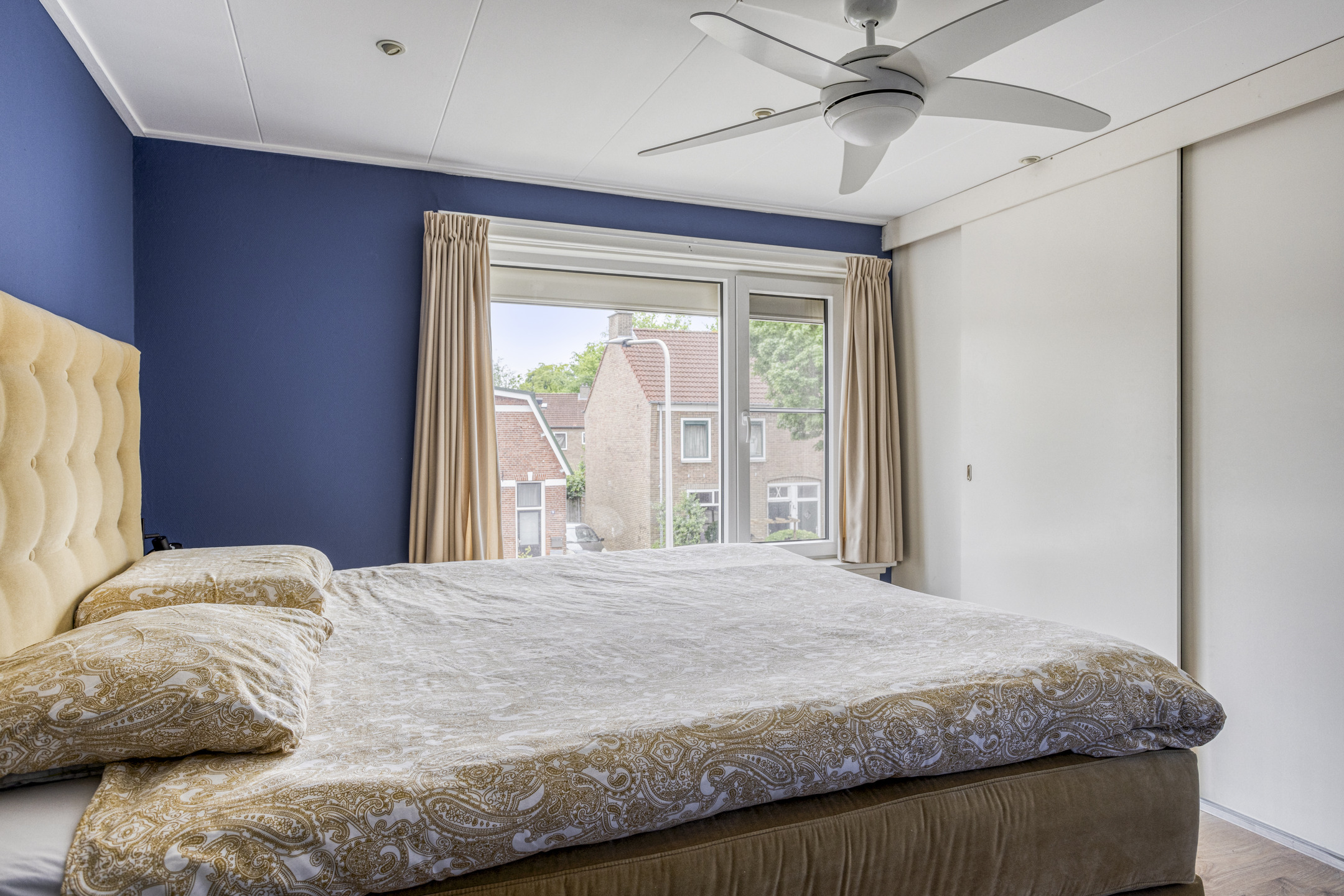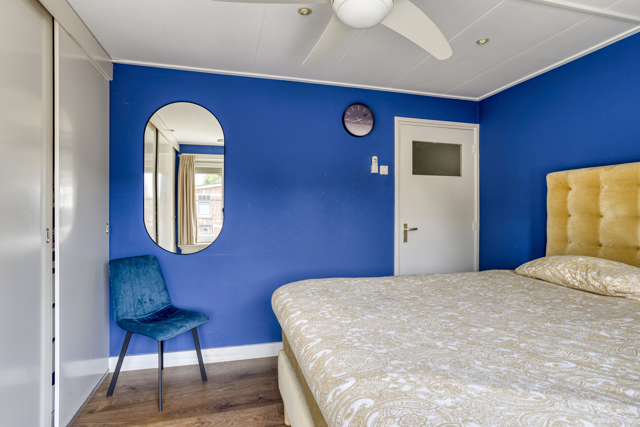 Overloop met vaste trap naar de zolderetage, 2 slaapkamers, waarvan de ouderlijke slaapkamer is voorzien van een grote inbouwkast. Op deze etage bevindt zich de badkamer, eveneens goed onderhouden en voorzien van toilet, douche en wastafelmeubel.